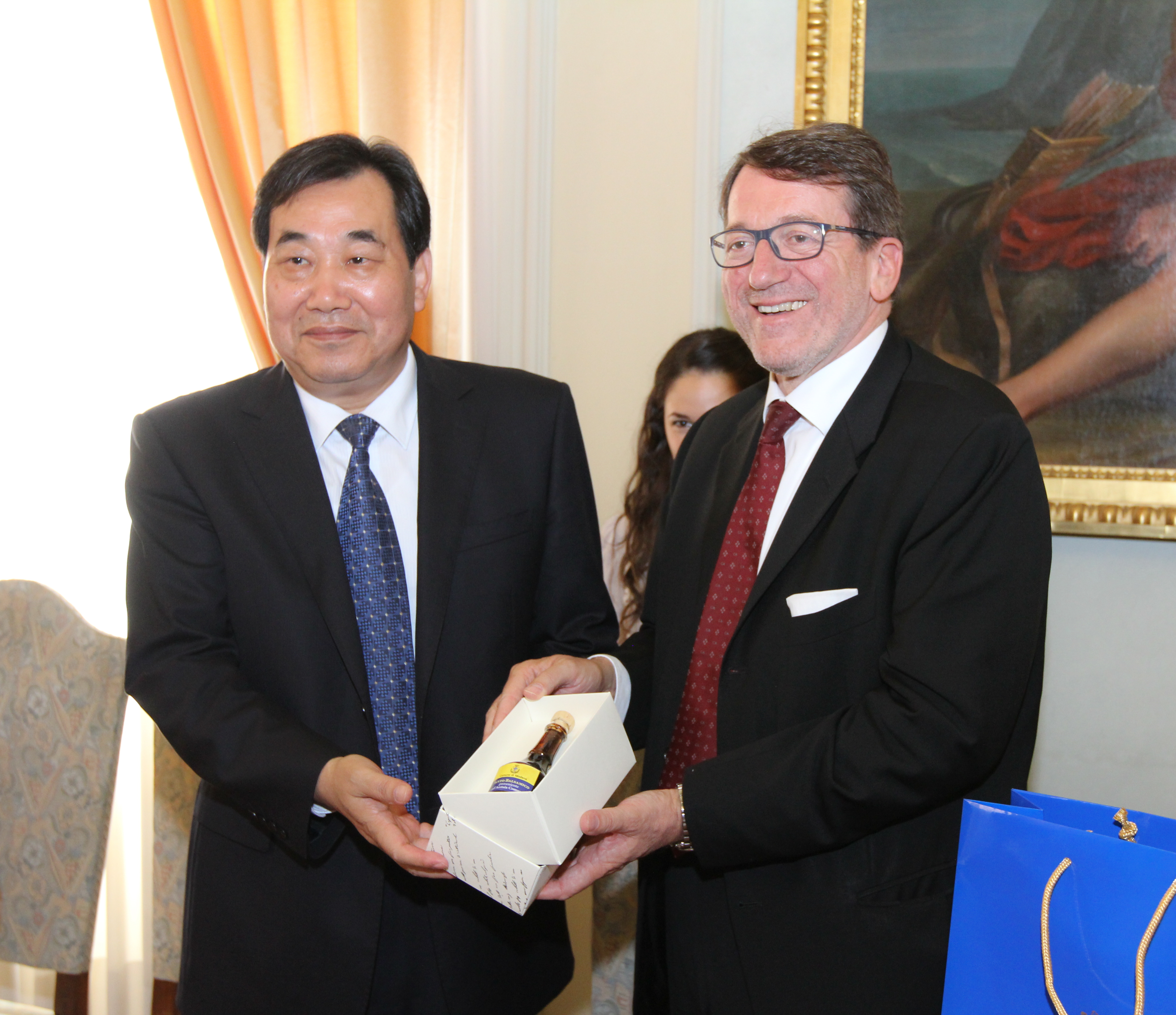 Nello scambio dei doni tra le due delegazioni non potavano mancare l’Aceto balsamico tradizionale dell’Acetaia comunale, il simbolo degli aquiloni di Weifang e un modellino dei prototipi di trattori che verranno realizzati dalla Goldoni spa.