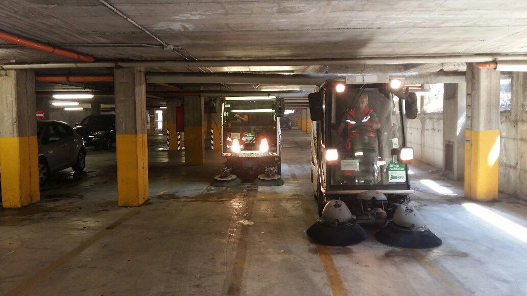 Nel garage sono intervenute due autospazzatrici, un pulivapor e tre addetti manuali con un motocarro.
