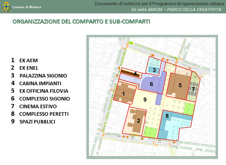 Nella parte pubblica, l’edificio ex Enel, candidato ai fondi europei messi a disposizione dell’Asse 6 del Por Fesr Emilia-Romagna 2014-2020, dedicato alla valorizzazione delle risorse artistiche e ambientali, diventerà sede di Ert, teatro nazionale, con due sale teatrali tra le quali il nuovo Teatro delle Passioni; l’ex centrale Aem, sulla quale l’avvio dei lavori è previsto entro fine estate (cofinanziato con contributo europeo attraverso le risorse dell’Asse 6 del Por Fesr), ospiterà Laboratori Aperti (Labs) ovvero spazi attrezzati con soluzioni tecnologiche avanzate in cui si sviluppano forme strutturate e innovative di confronto, cooperazione e collaborazione tra i diversi operatori in ambito culturale. L’ex Officina Filovia ospiterà invece la palestra del Liceo Sigonio (per cui il Comune ha stanziato un contributo finanziario pubblico per l’importo di 2 milioni di euro) e altri servizi.
