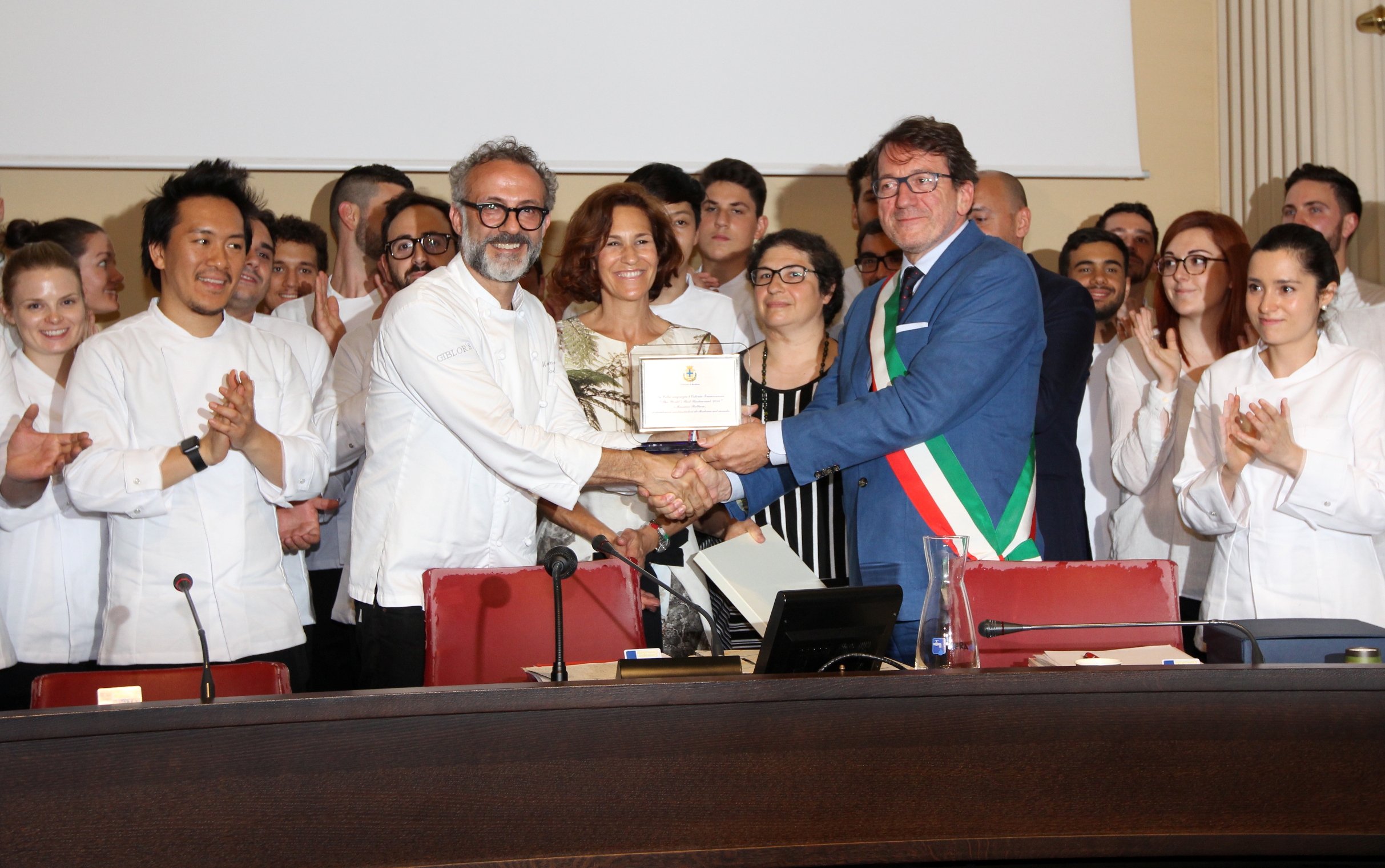 Bottura, nel suo intervento, ha evidenziato l’importanza del fare squadra e del promuovere la cultura, ha valorizzato il ruolo dell’agricoltura del territorio e del turismo gastronomico da cui l’Italia deve ripartire. “Quella in via Stella – ha detto – è una bottega rinascimentale in cui si crea cultura, una fabbrica di idee che rendere visibile l’invisibile a tanti, un luogo in cui si formano ambasciatori del nostro pensiero e delle eccezionali materie prime del territorio, e si creano contaminazioni sane, con la condivisione di vittorie e sconfitte, che aiutano a migliorare. Si fa cultura perché la cultura genera conoscenza, la conoscenza apre la coscienza e con la coscienza cresce il senso di responsabilità: senza la cultura non saremmo mai riusciti ad arrivare fin qui”. Bottura ha poi sottolineato come la scelta di contribuire al recupero degli alimenti, contrastando lo spreco, sia dettata dalla volontà “di restituire qualcosa nel momento in cui raggiungi tutto”, da qui l’esperienza del refettorio già realizzato a Rio de Janeiro e in altre città dopo Expo, che verrà presto sviluppata anche a Modena.