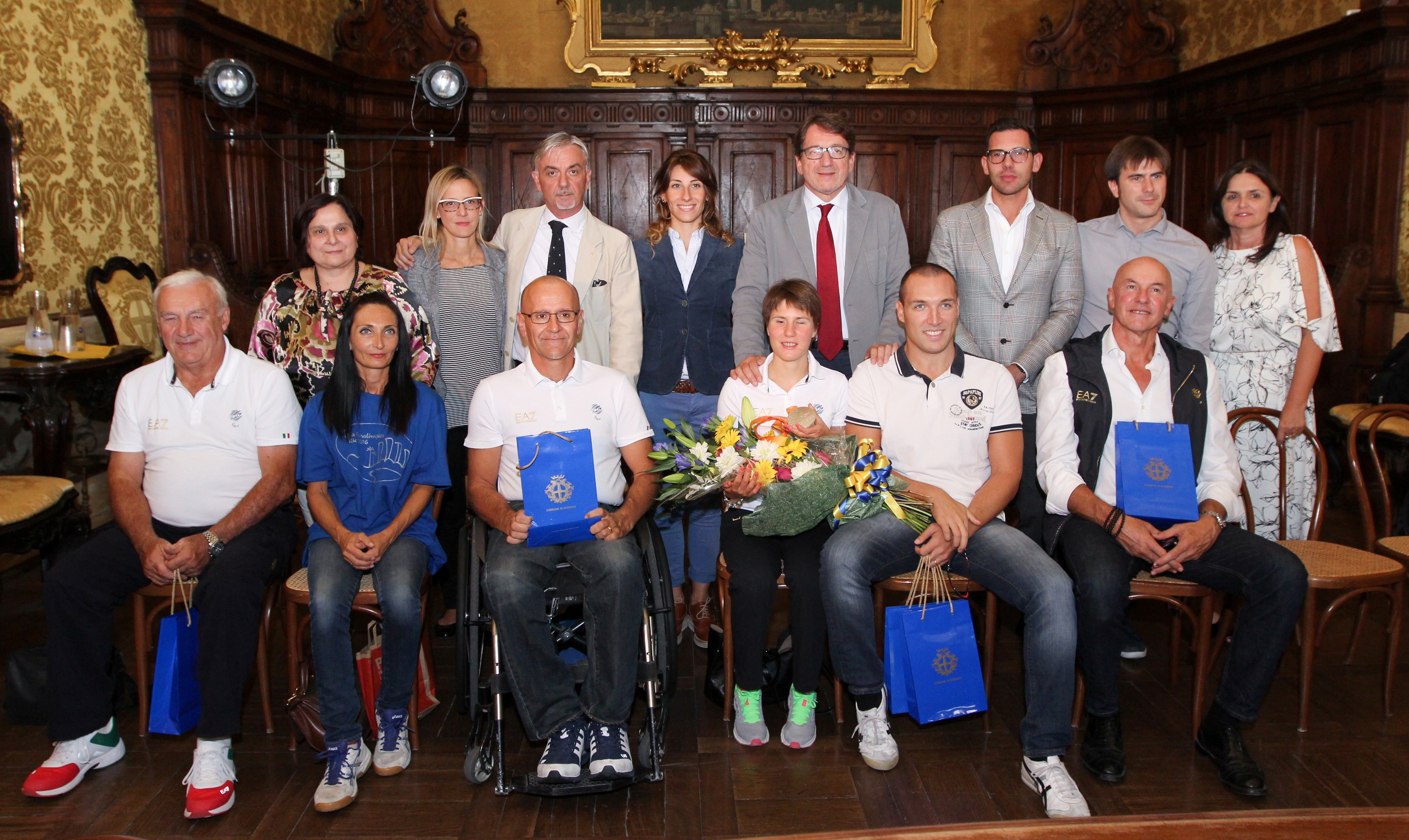 Seduti, da sx: Marco Pedrazzi, commissario tecnico Fit Arco; Lisa Bertacchini, moglie di Fabio Azzolini; Fabio Azzolini; Cecilia Camellini; Matteo Poli, allenatore di Camellini; Franco Bertoli, mental coach di Azzolini