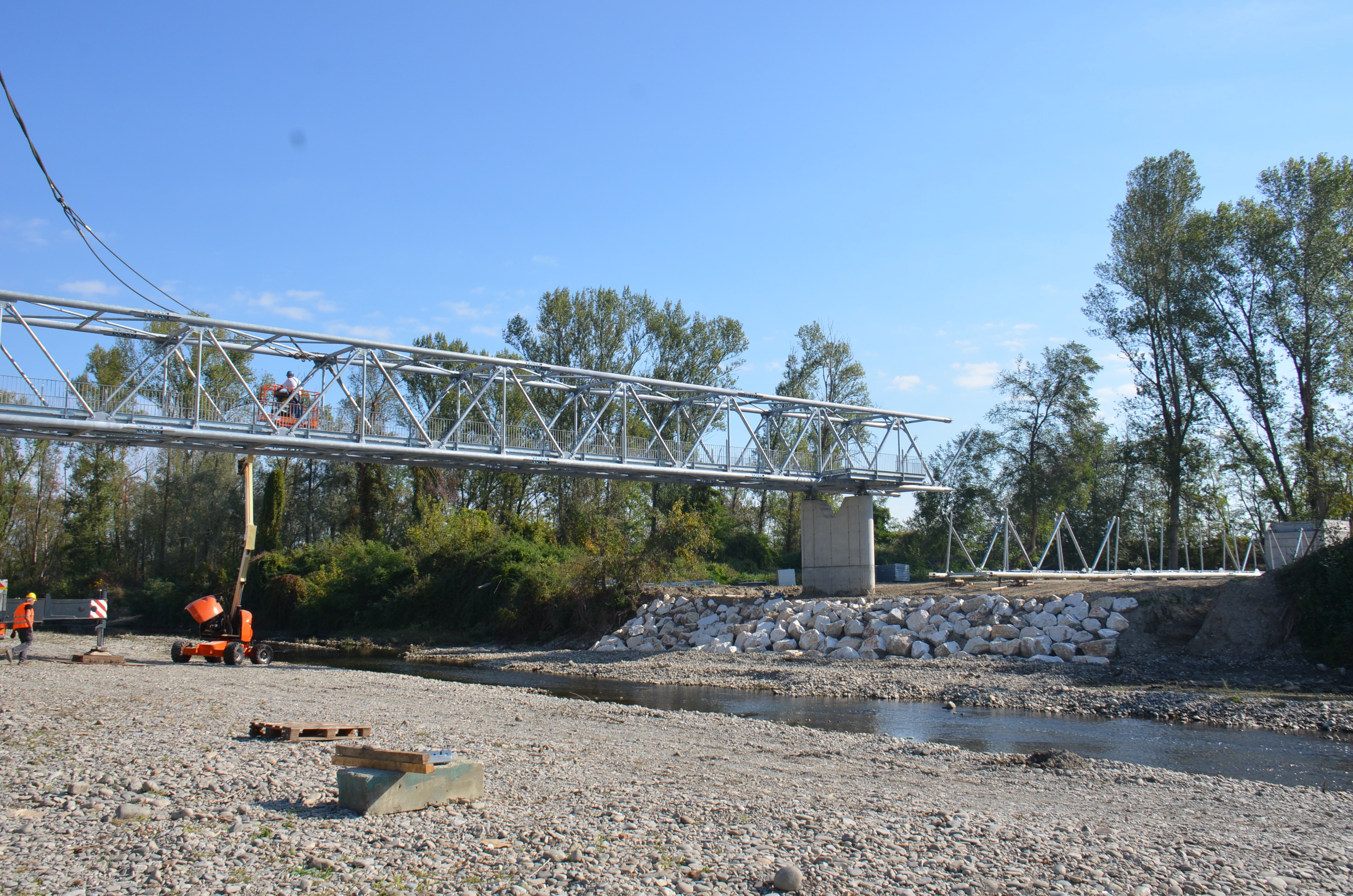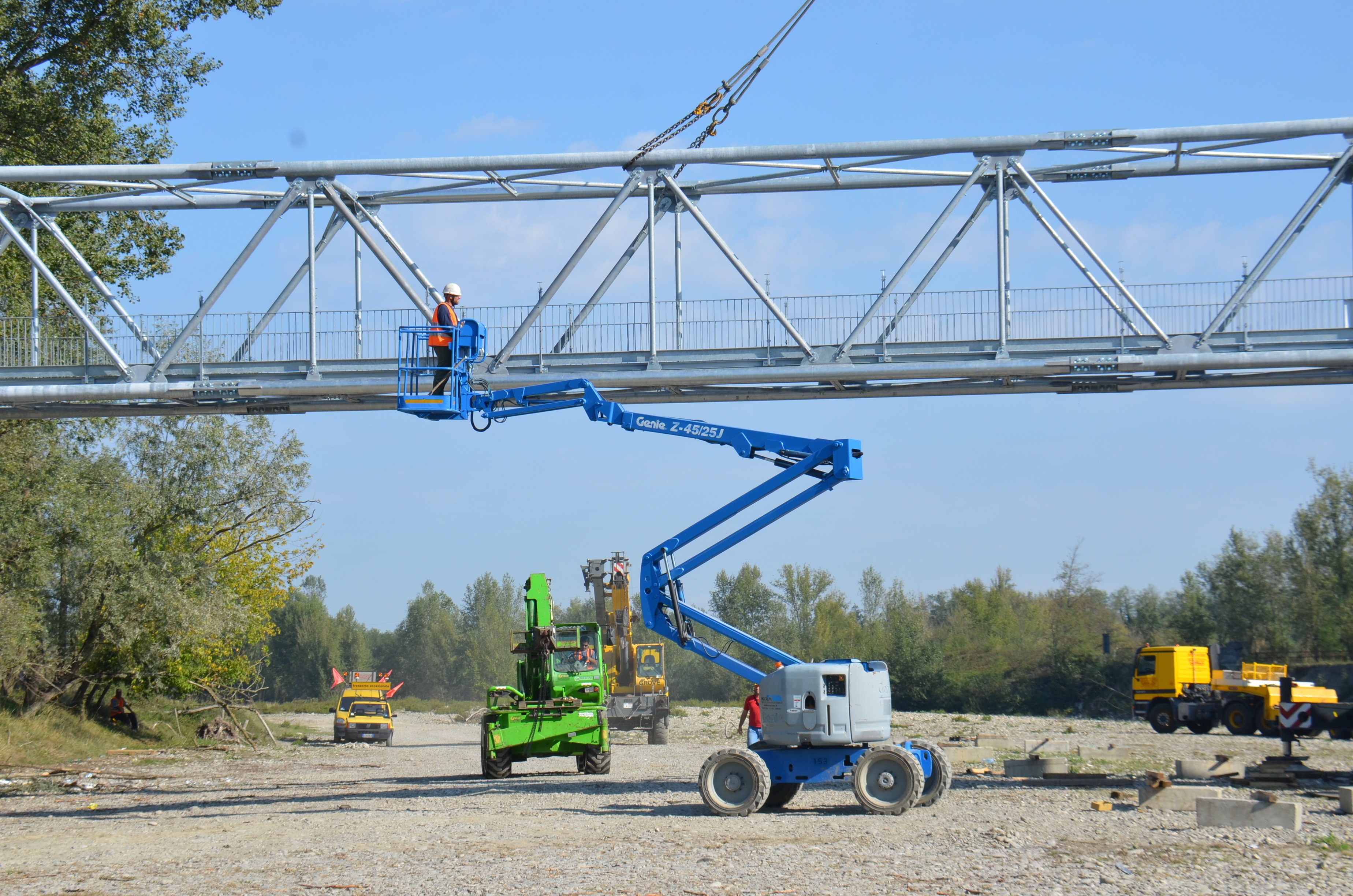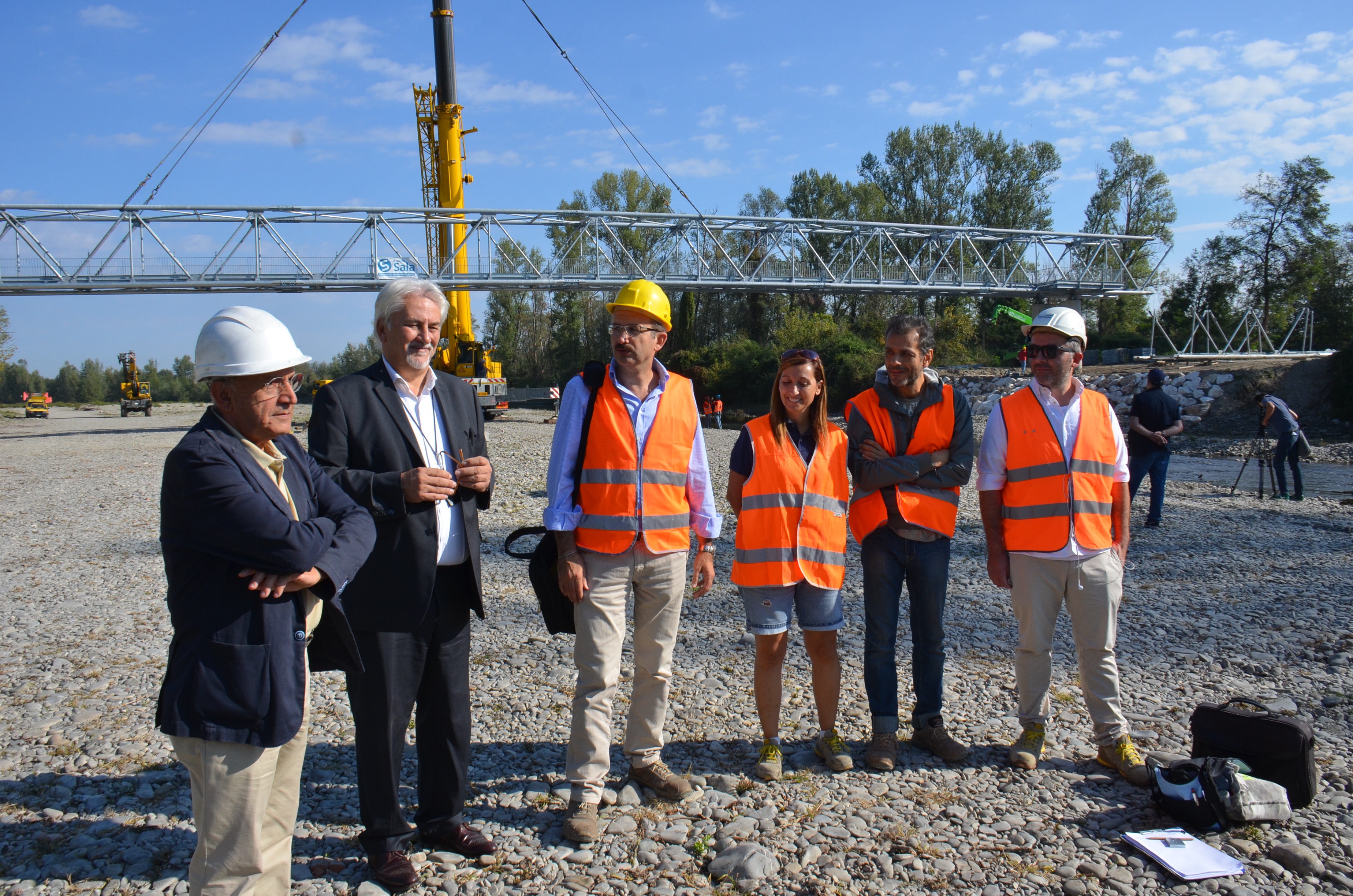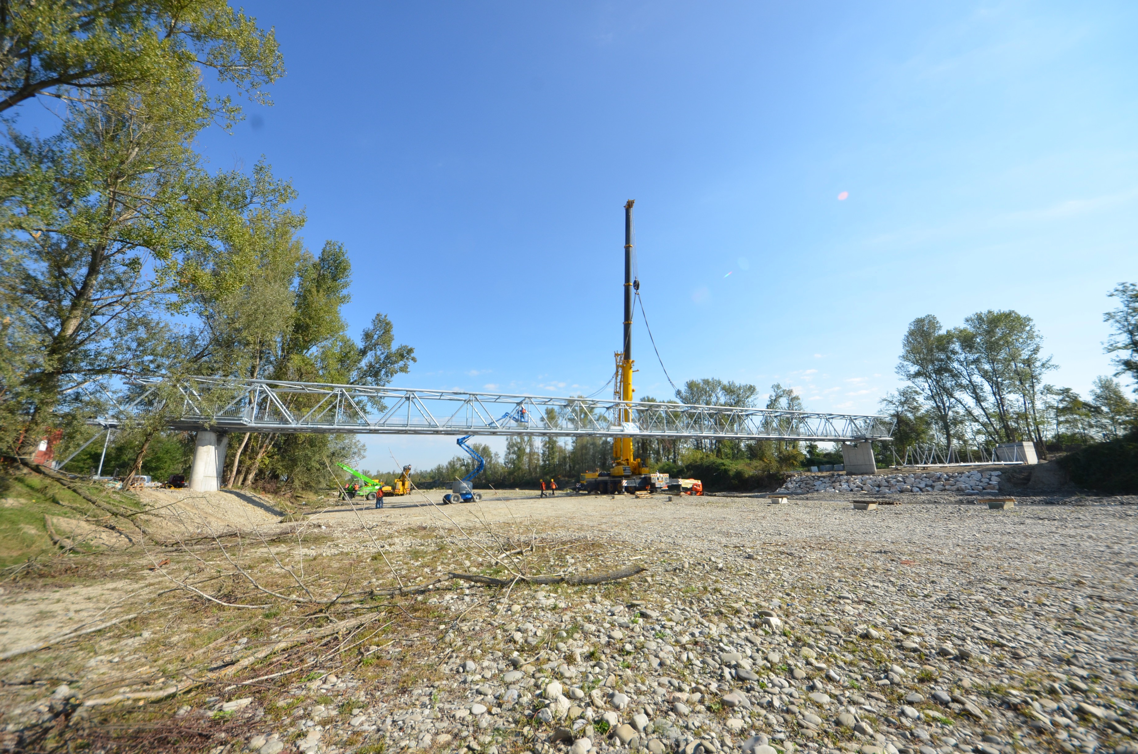 Con la posa della passerella di 70 metri, avvenuta oggi, venerdì 30 settembre, una delle tre previste nel progetto come collegamento tra le due sponde del fiume Panaro (le altre sono di 45 metri), entra nella fase finale la realizzazione del primo stralcio del percorso ciclopedonale tra San Donnino a Modena e San Cesario con lavori che si concluderanno intorno a metà novembre.