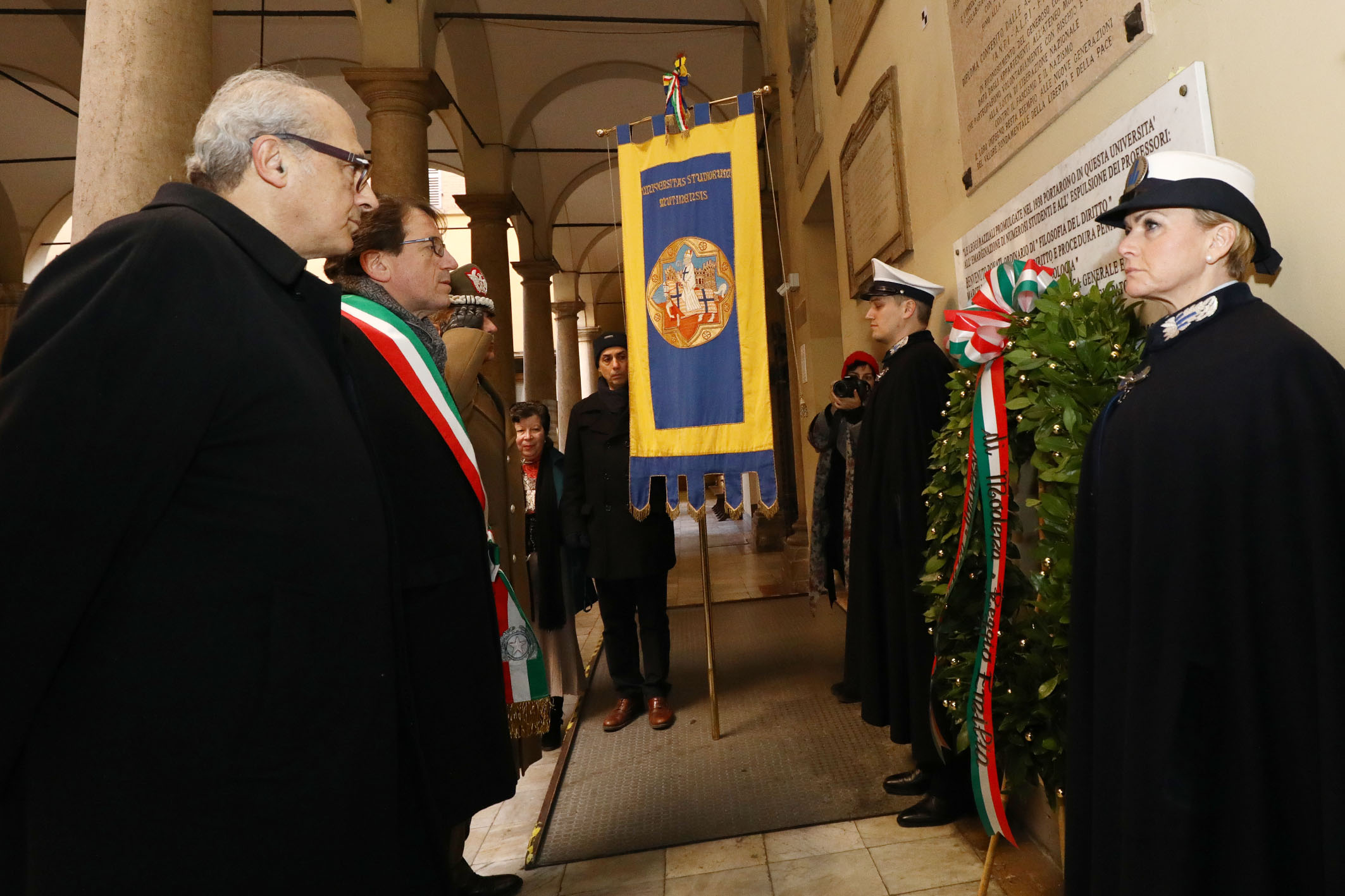Dinnanzi alla lapide collocata a ricordo dei docenti modenesi allontanati nel 1938 dall’insegnamento a seguito della promulgazione delle leggi razziali volute dal regime fascista, il sindaco Muzzarelli, il rettore Angelo Andrisano e il comandante dell’Accademia Salvatore Camporeale, insieme ai rappresentanti della comunità ebraica e alle associazioni partigiane, hanno collocato una corona d’alloro per ricordare un giorno tragico della storia italiana.