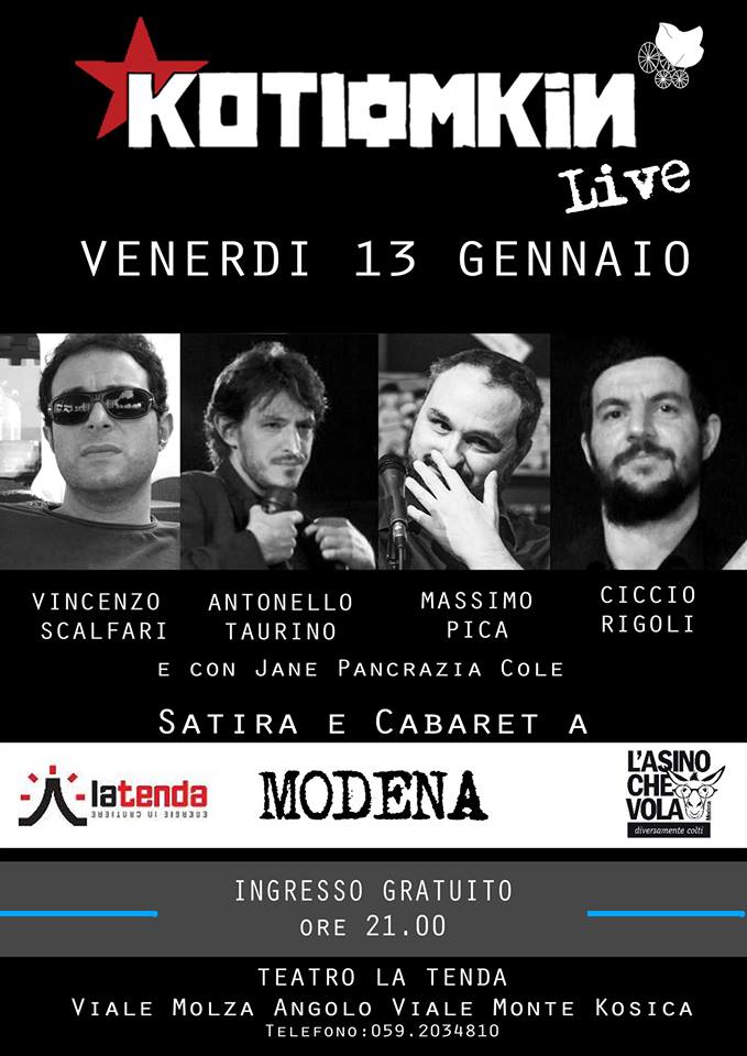 È dedicata alla satira e al cabaret “Kotiomkin live”, la serata in programma venerdì 13 gennaio alla Tenda di viale Monte Kosica a Modena. Protagonisti, in video e dal vivo, gli artisti del collettivo di satira on line che conta oltre 400 mila fan sui social network. La serata, promossa dall’associazione L’asino che vola nell’ambito della rassegna Dialogo con l’autore, inizia alle 21. L’ingresso è libero.