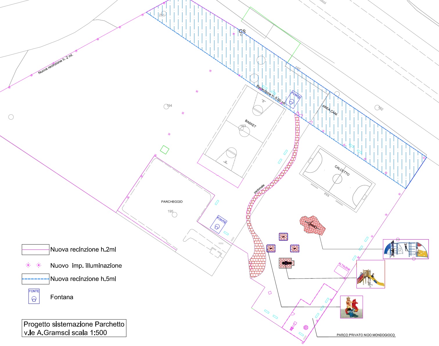 Ad essere interessata dal progetto è l’area verde in fondo al viale che dal confronto con cittadini e associazioni è emersa essere particolarmente critica. Il progetto che intende rivitalizzarla e restituirla alla frequentazione dei cittadini prevede quindi che si proceda al rifacimento della recinzione e delle cancellate carrabili; saranno inoltre ripristinati i campi da basket e da calcetto, installati nuovi giochi per bambini e realizzata un’area cani.