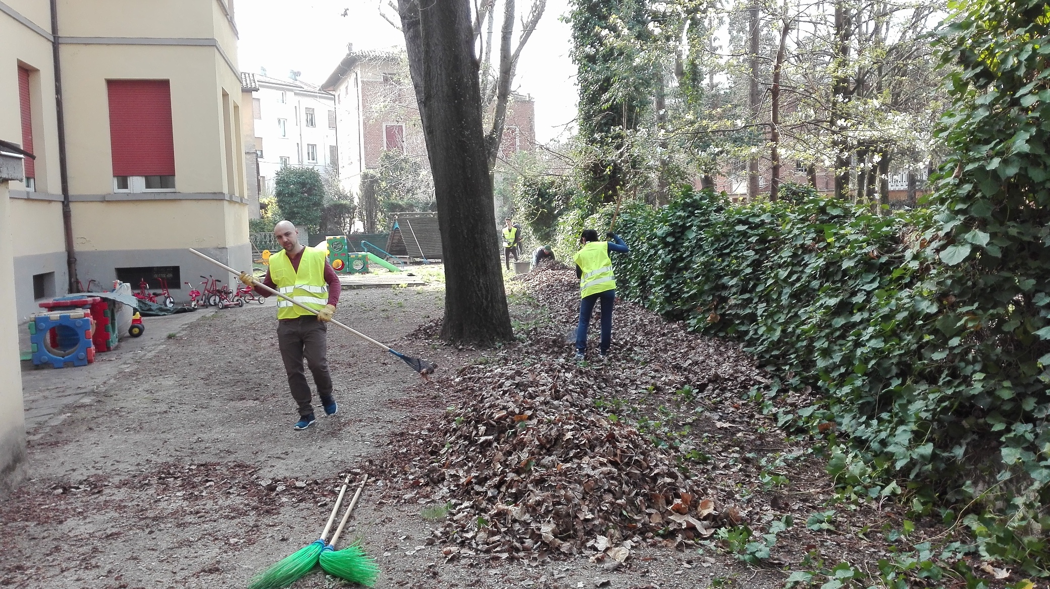 Raccolta di foglie anche per i volontari del Quartiere 3 che, armati di rastrelli e ramazze, sono intervenuti nel cortile della scuola d’infanzia Andersen, in questo caso in collaborazione con i genitori dei bimbi iscritti e di uno studente del liceo Wiligemo.