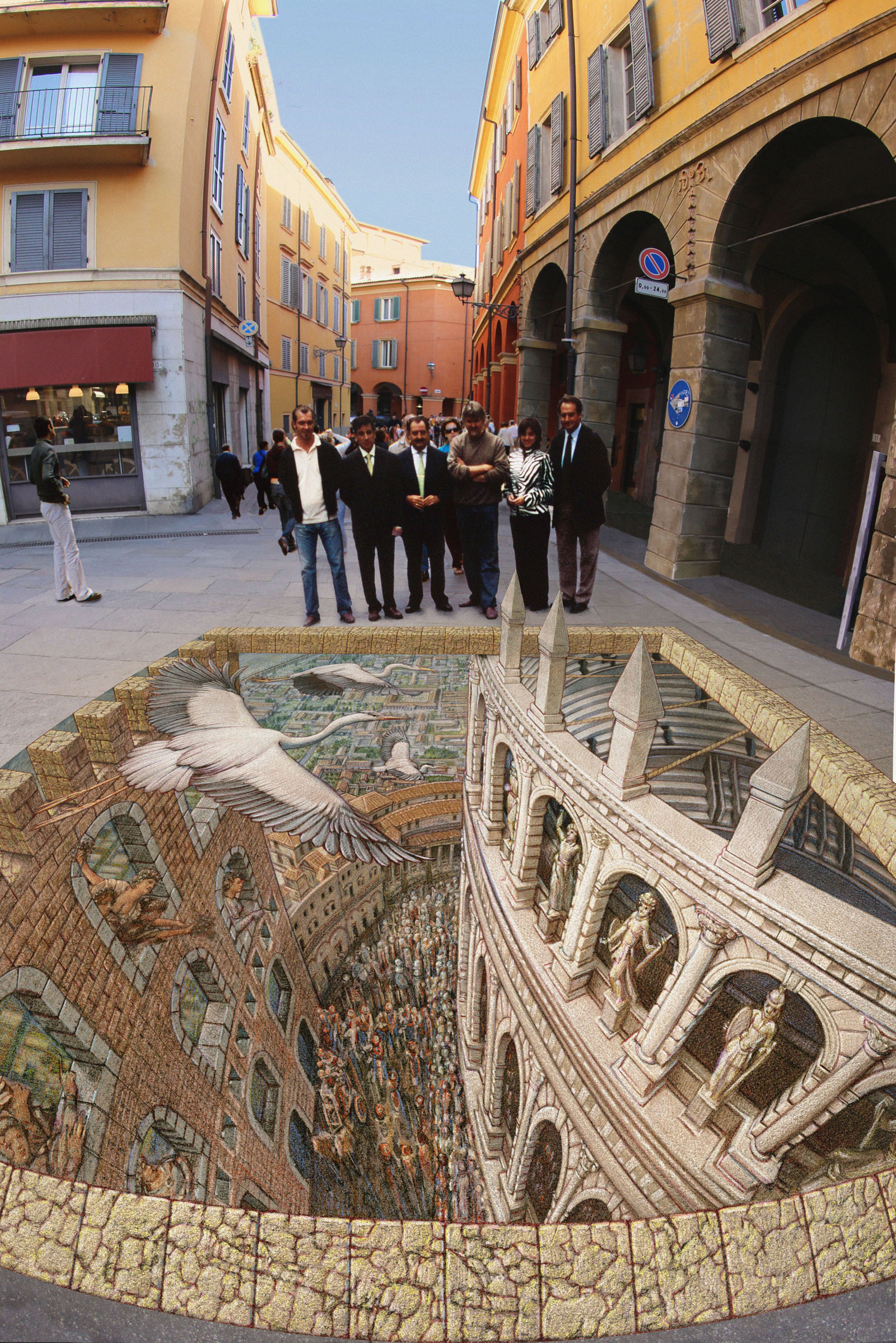 Arte, per sua natura effimera, la street art 3D applicata alle pavimentazioni di strade e piazze, è passata negli ultimi anni dai gessetti colorati all’elaborazione digitale del disegno, poi stampato su materiale resistente e fissato al terreno. A Modena, parte dell’esecuzione sarà realizzata dal vivo, durante un “work in progress” che durerà tre giorni, dal 12 al 14 maggio.
