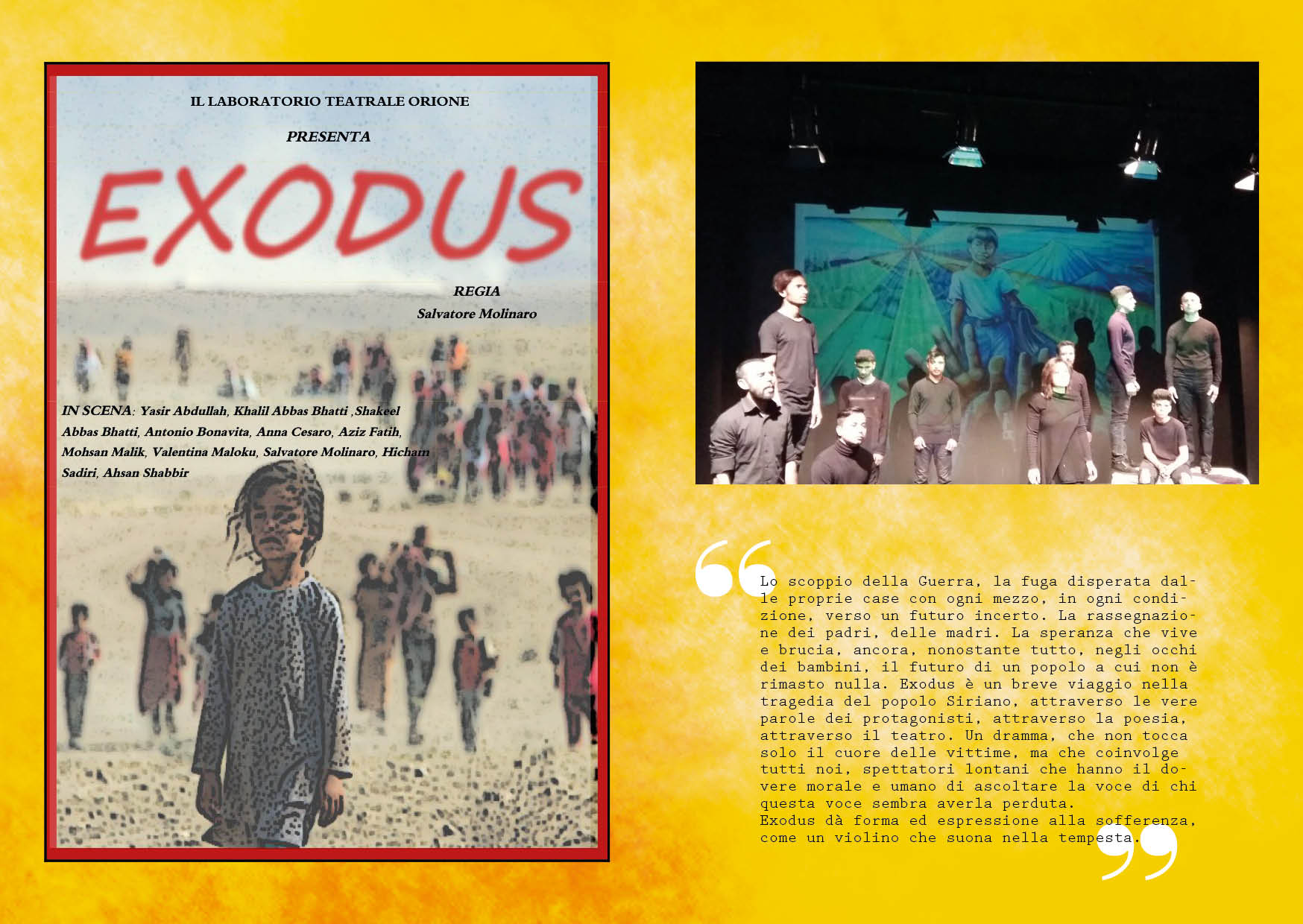 WelcHome ha fatto scuola. È entrato nelle aule e ora porta gli studenti a toccare con mano la realtà dei minori stranieri non accompagnati anche attraverso il teatro. Sabato 27 maggio al Teatro Tenda di piazzale Molza (angolo Monte Kosica) va in scena “Exodus”, spettacolo realizzato dal regista Salvatore Molinaro nell’ambito del Laboratorio teatrale Orione 80. “Exodus” è un breve viaggio nella tragedia del popolo siriano attraverso le parole dei protagonisti, la poesia, il teatro. Tra gli attori, a recitare o a rivivere la propria storia davanti a un pubblico di giovani studenti modenesi, ci saranno anche ragazzi attualmente o in passato accolti nella comunità dell'Opera Don Orione di Magreta.