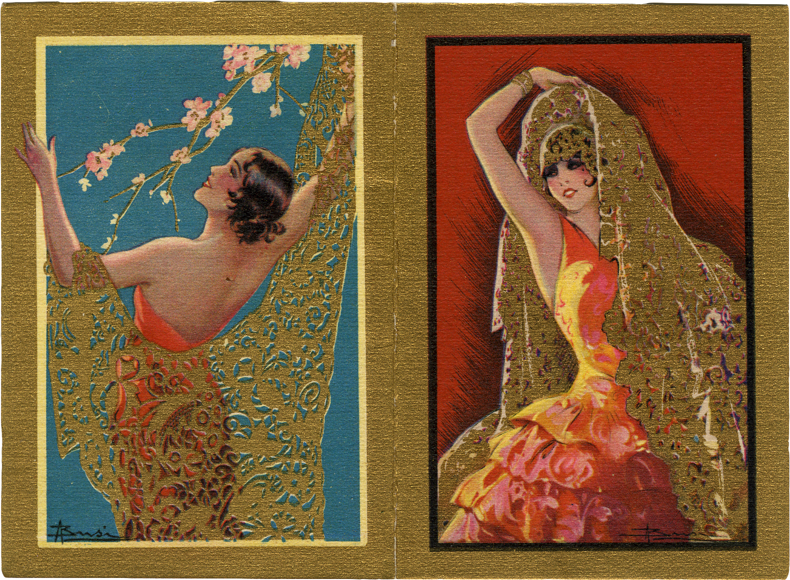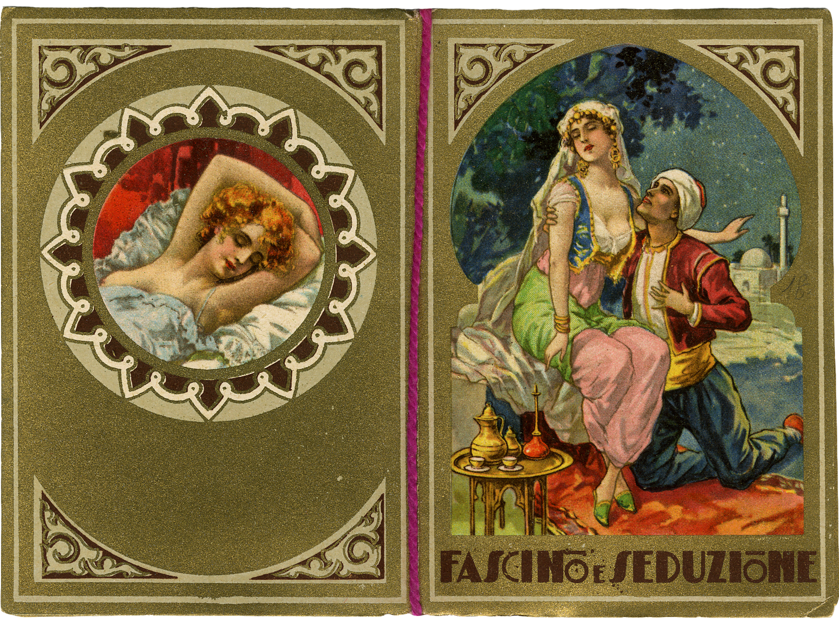 Quella tra il 1920 e il 1940 è la stagione più felice per i calendarietti e la micrografica sia per l’apporto di illustratori di grande richiamo – da Codognato a De Bellis, da Carboni a Romoli, solo per fare qualche nome – sia per lo stile di cui erano significativi testimoni: quei prodotti rappresentavano il risultato di un’estetica nuova, di fascino ed eleganza, che presto si definì come gusto déco. Un linguaggio figurativo fondato su una ricercata armonia geometrica, ridondante di motivi ritmici quali scacchiere, cerchi concentrici, linee segmentate onnipresenti nella decorazione dei costumi e degli arredi, dove le storie erano rappresentate in ambientazioni da sogno, tra profusioni d’oro e d’argento che ne ornavano le pagine.