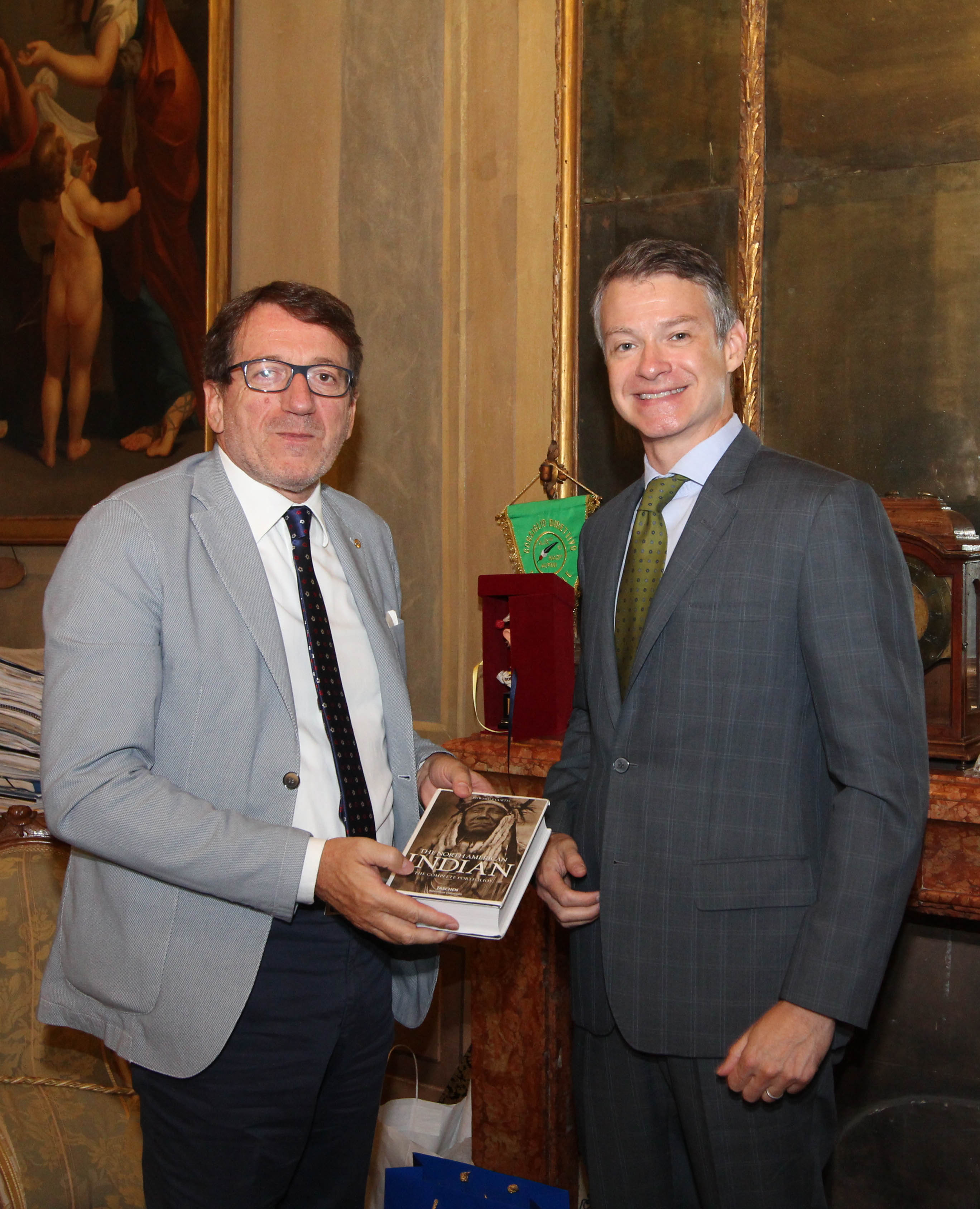 Al console il sindaco ha donato il libro “Modena, Effetto notte”, con le fotografie di Franco Fontana, ricevendo in omaggio un volume fotografico dedicato ai nativi americani (“The North American Indian”).