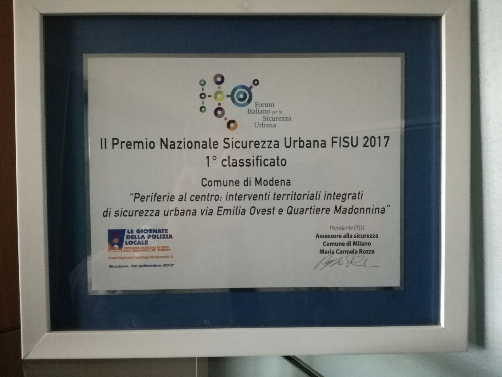 Il riconoscimento, 5mila euro da utilizzare per organizzare un evento di carattere internazionale finalizzato alla promozione dell'esperienza di progettazione politica sulla sicurezza urbana praticata, è stato consegnato venerdì 22 settembre nell'ambito del Convegno nazionale “Le Giornate della Polizia Locale” di Riccione, presenti il Comandante della Polizia municipale Franco Chiari e Antonietta de Luca dell'ufficio Politiche per la Legalità e le sicurezze.