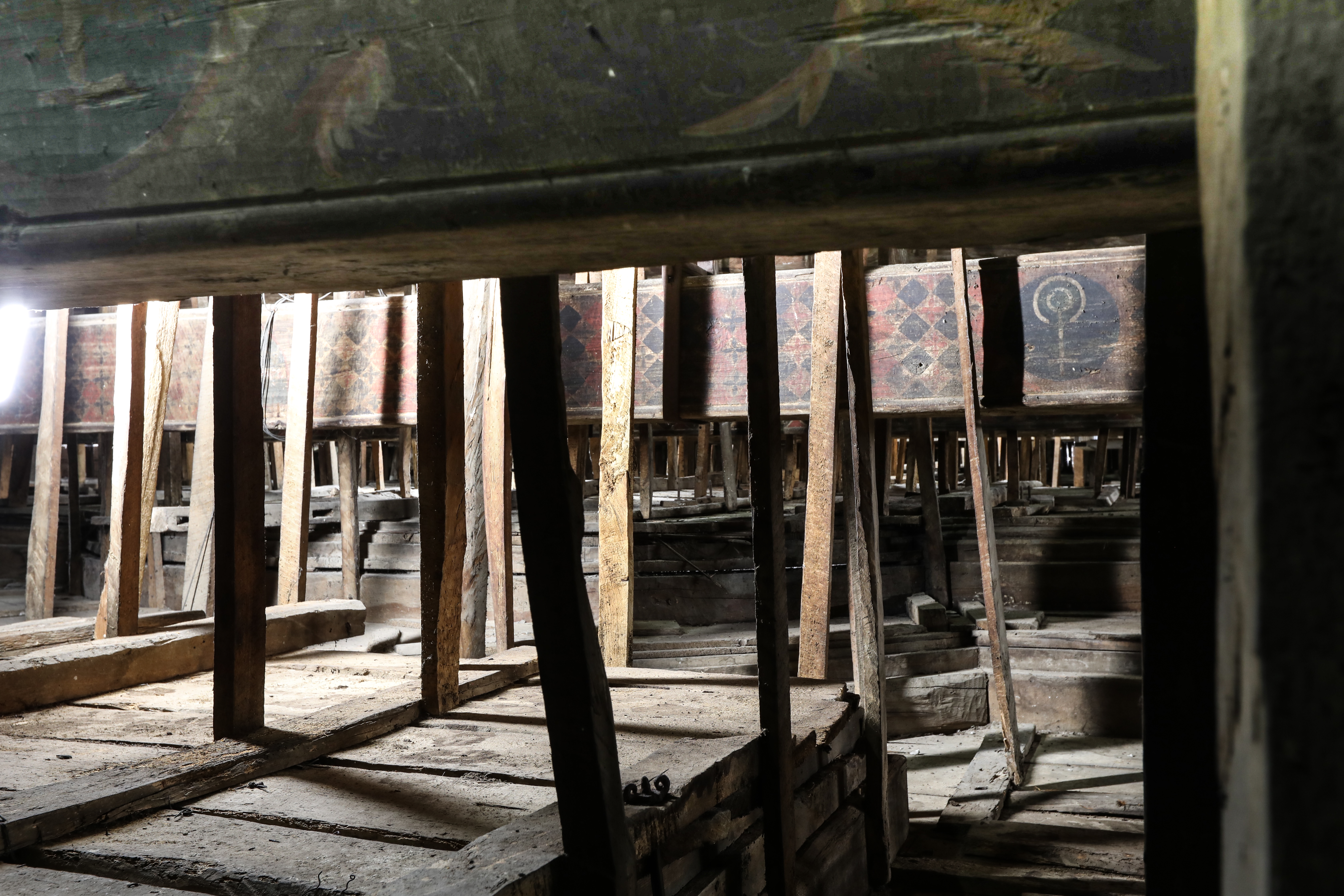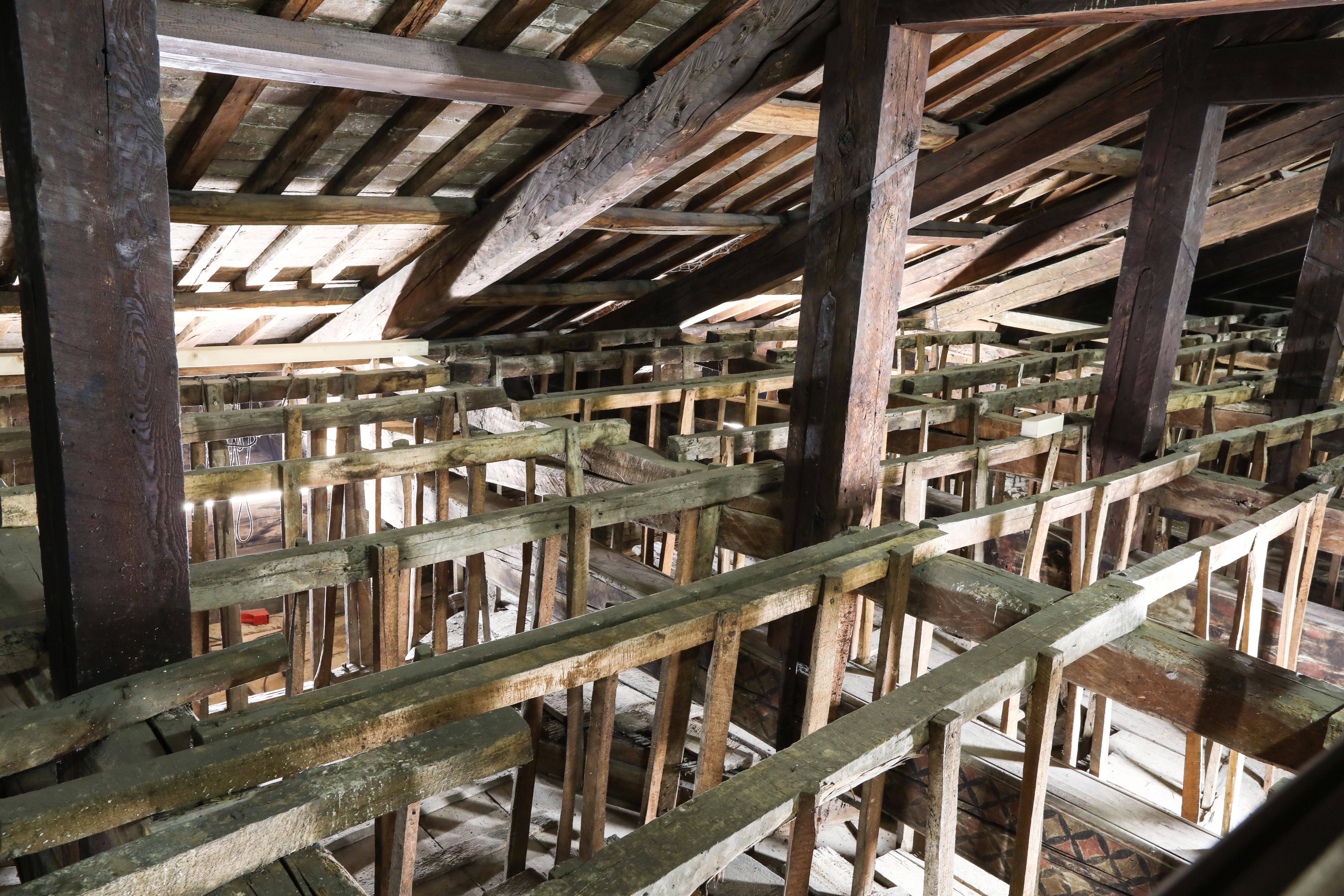 Dai banchi, guardando all’insù, il soffitto della chiesa S.Agostino appare un tutt’uno, con preziosi dipinti che raffigurano l’apoteosi di alcuni santi particolarmente cari agli Estensi. Ma da sopra, nel sottotetto, è ora visibile l’intera struttura di supporto, costituita da alcune centinaia di pendini in legno inchiodati alle travi del tetto a sostegno dei cassettoni che compongono il soffitto.