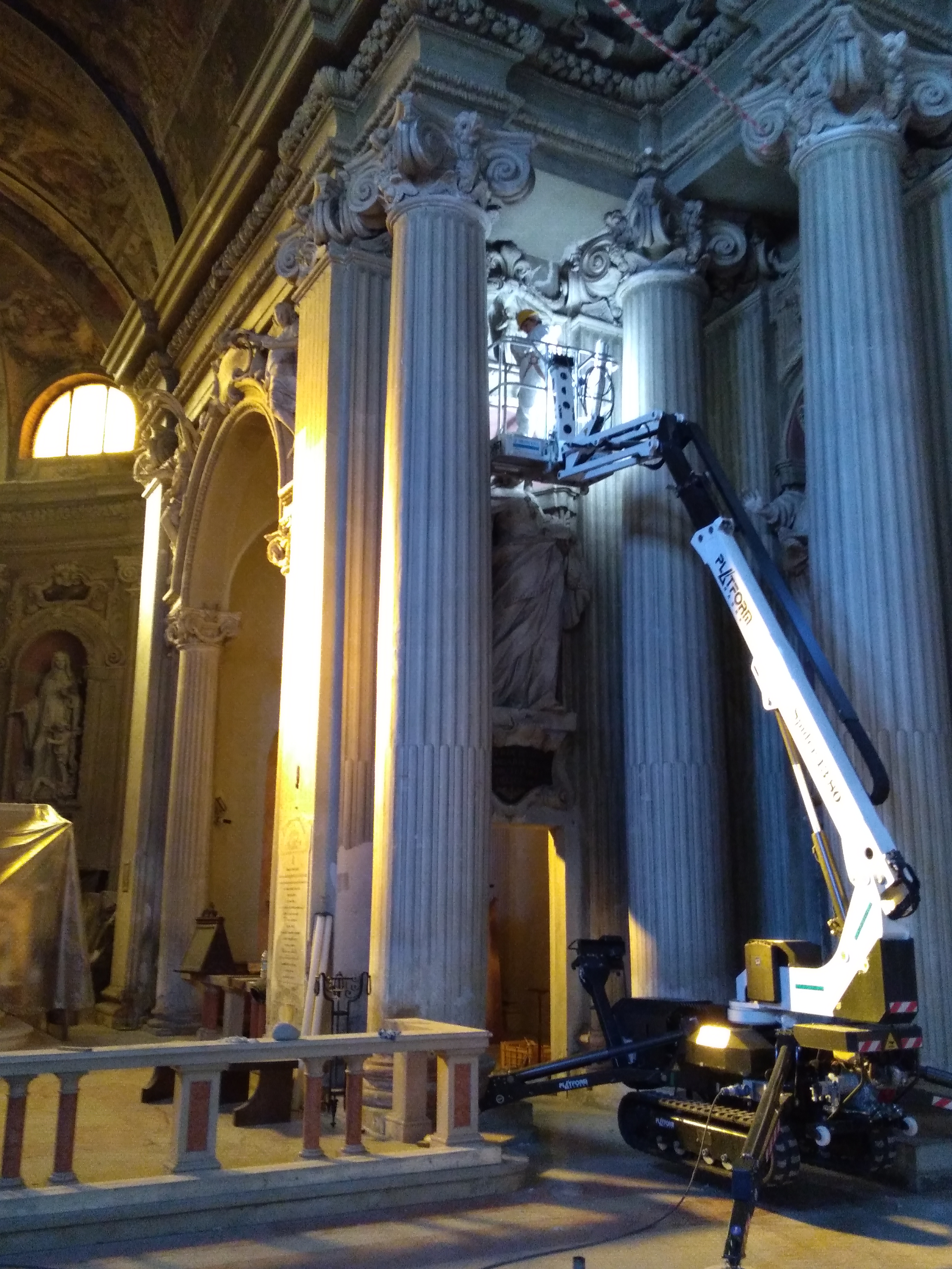 Ad oggi sono stati ultimati i lavori di controllo dell’efficienza del controsoffitto in legno e di sostituzione degli elementi di sospensione ammalorati previa aspirazione della polvere e dei depositi all’estradosso (circa 2 tonnellate rimosse), ed è stata completata la centrale termica, con la sostituzione delle caldaie con generatori di calore a condensazione. Quasi ultimati anche i lavori di riparazione e restauro delle pedane della cantoria e gli interventi di verifica e riparazione degli stucchi, realizzata mediante rimozione di depositi superficiali incoerenti a secco, iniezione di emulsioni consolidanti, inserimento di perni in acciaio, microstuccatura, eventuale integrazione plastica di parti mancanti, e patinatura finale per integrazione cromatica. Sono in corso il consolidamento del solaio in legno della cappella (appartamento del parroco) mediante cappa armata in calcestruzzo alleggerito e connettori, e le riparazioni murarie, scuci cuci, iniezioni e connettori. Rimangono inoltre da realizzare le strutture metalliche volte a contrastare il ribaltamento della facciata principale e l’installazione delle pedane radianti che verrà fatta verso la fine del cantiere. Il nuovo impianto di riscaldamento sarà un sistema a tappeto radiante alimentato ad acqua assimilabile a un semplice arredo: sarà infatti costituito da pedane appoggiate al pavimento al di sotto dei banchi. Avrà la funzione di diffondere calore nella parte della navata occupata dai banchi e nella zona del presbiterio destinata alle celebrazioni. A protezione delle opere d’arte presenti nella chiesa sarà inoltre installato un impianto d’antifurto.