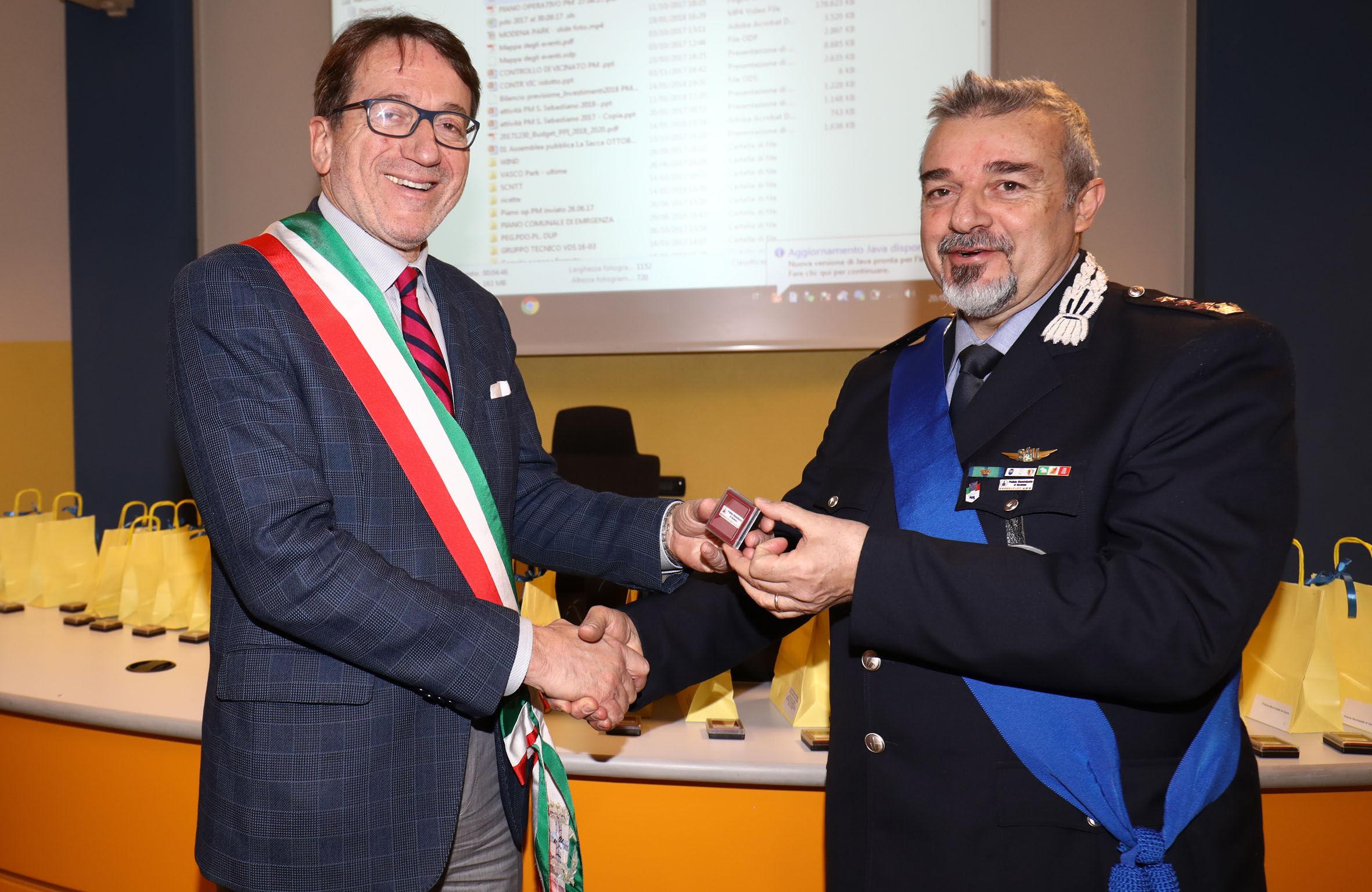 Dopo l’intervento del sindaco Gian Carlo Muzzarelli che ha ringraziato tutte le donne e gli uomini del Corpo, la cerimonia si è spostata al Comando, dove il comandate della Polizia municipale Franco Chiari ha consegnato un’attestazione di riconoscenza dell’amministrazione agli operatori della municipale intervenuti nello svolgimento dei servizi in occasione di ModenaPark.