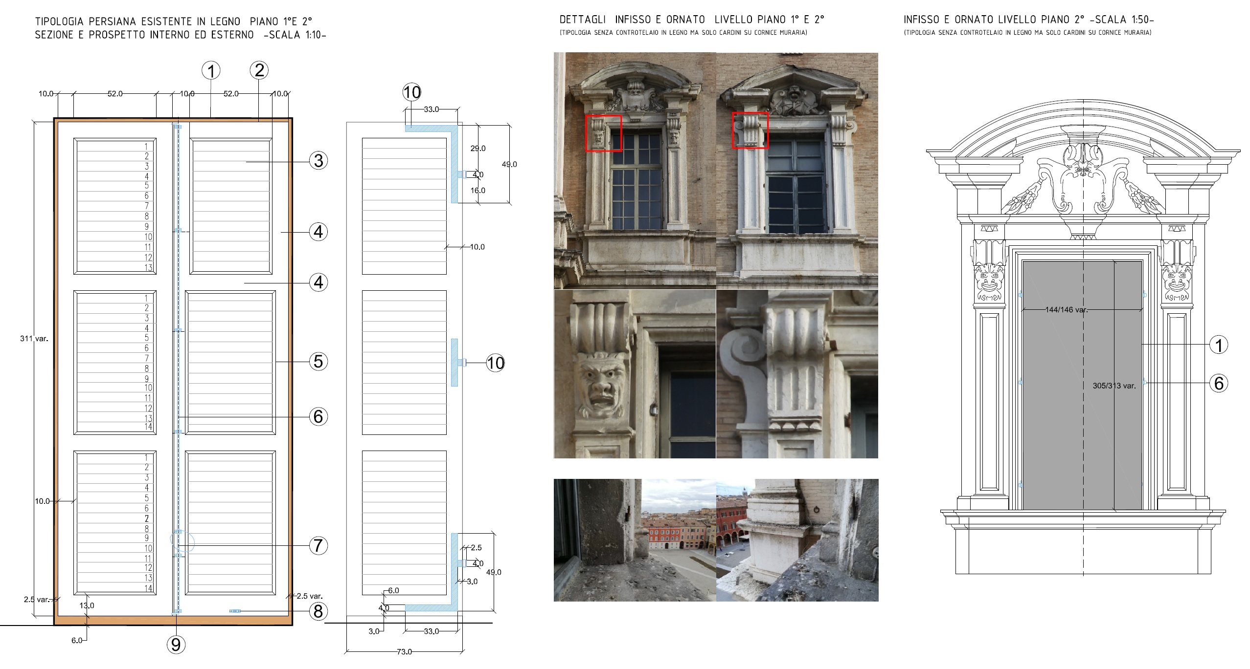Per 27 delle 48 persiane storiche in essenza di larice si prevede il restauro, mentre per le altre, in condizioni non più recuperabili, si procederà alla sostituzione con il rifacimento con le stesse misure e gli stessi metodi costruttivi di quelle originali. Le stesse procedure verranno utilizzate anche per le basi dei controtelai.
