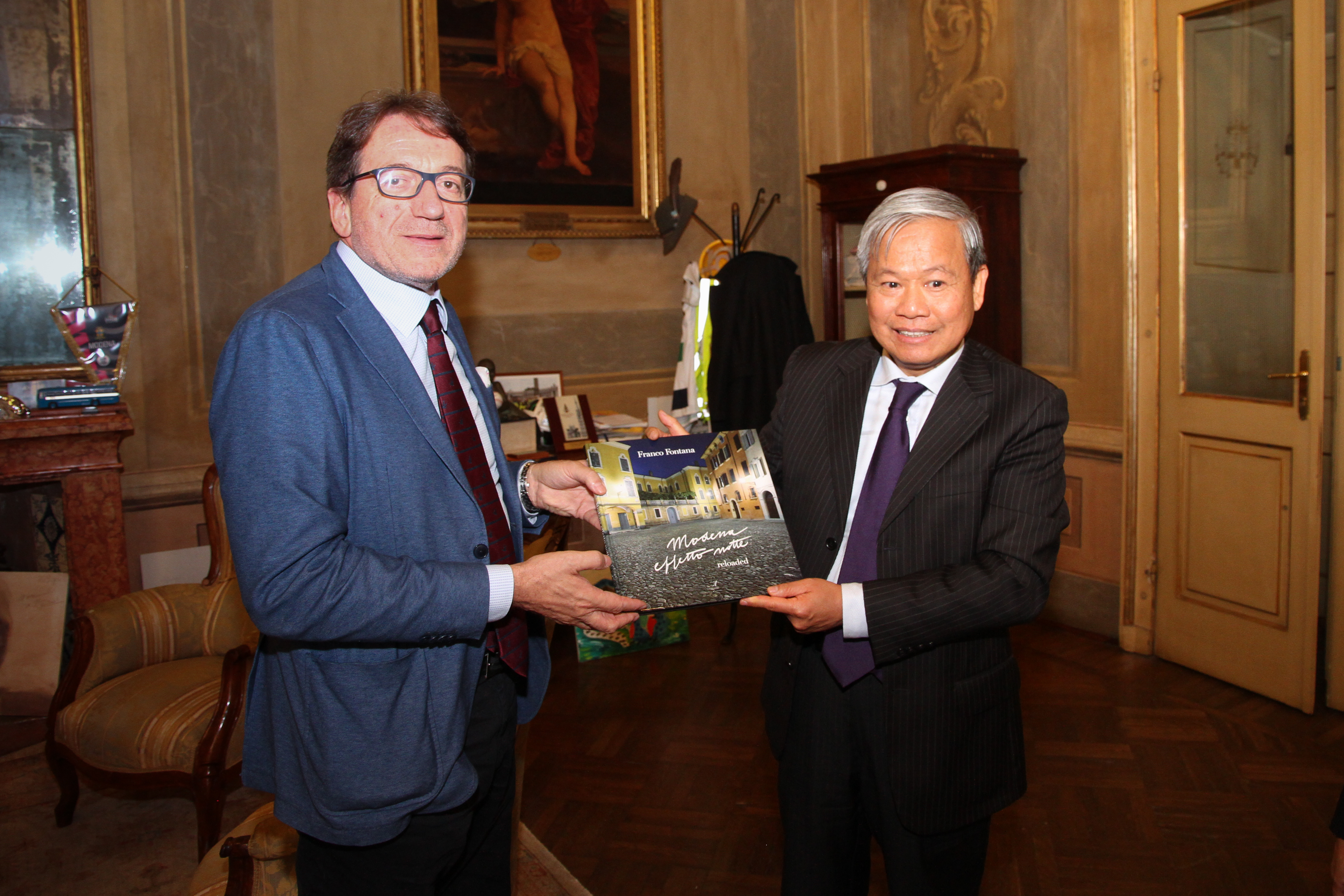 Il sindaco Muzzarelli ha donato all’ambasciatore un libro fotografico di Franco Fontana “Modena di notte” e ha ricevuto in dono un’opera d’arte che riproduce Torre tartaruga, con una barca a remi e un albero in primo piano, simbolo del Paese e della capitale Hanoi.