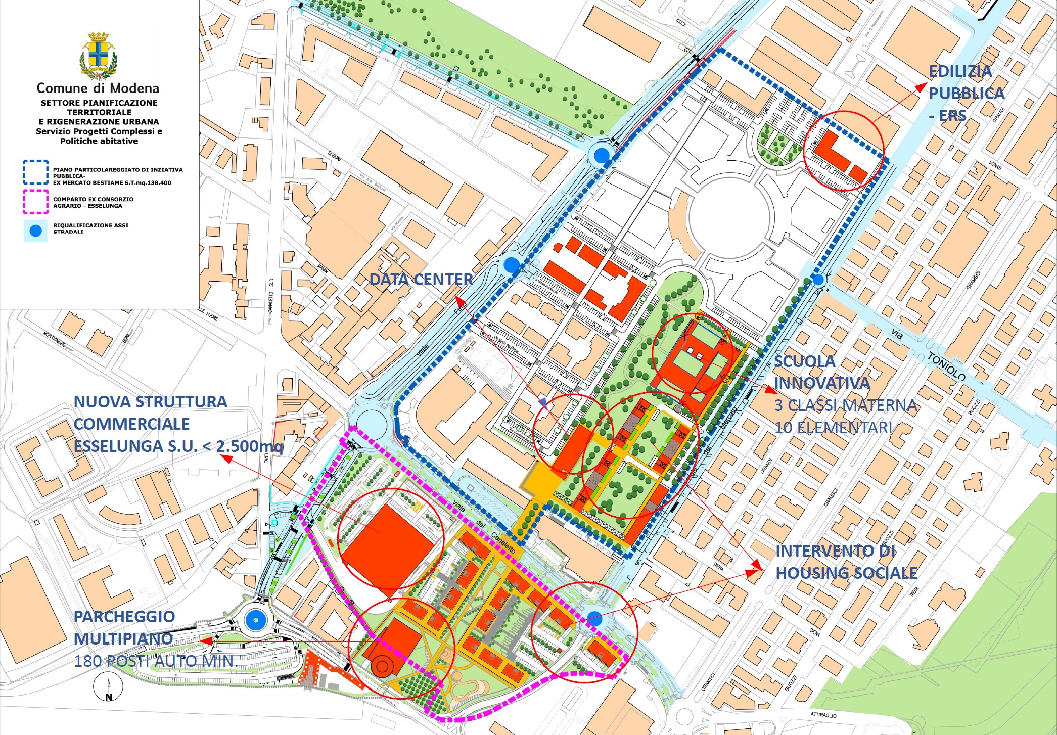 L’Accordo è relativo all’area di 51.378 metri quadri che rappresenta attualmente il comparto dell’ex Consorzio agrario, non considerando quindi i 2.916 metri quadri a ovest dell’area sui quali sono in corso interventi appaltati dal Comune per un collegamento stradale proprio nell’ambito del Progetto Periferie.