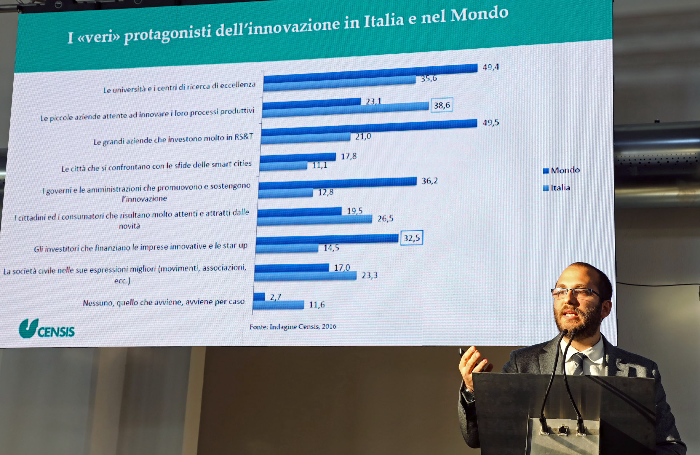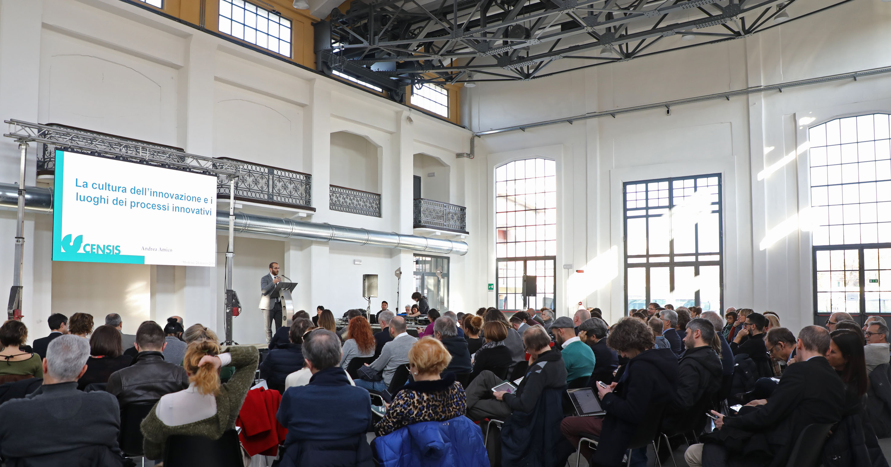 Il sindaco Gian Carlo Muzzarelli ha introdotto l’evento ricordando la natura e le prospettive degli spazi recuperati, destinati a diventare la porta della città sull’innovazione nei campi dell’arte, della cultura e della creatività, mentre Ludovica Carla Ferrari, assessora comunale alla Smart City, si è occupata dell’innovazione come scelta trasversale per lo sviluppo della città. Illustrando in apertura la ricerca del Censis, il ricercatore Andrea Amico ha spiegato che “l’Italia ha bisogno di una cultura dell’innovazione niente affatto standardizzata: non una generica passione per tutto ciò che è nuovo e buono in quanto tale (quasi un’anacronistica riedizione dello spirito futurista), ma di qualcosa che si orienti verso un punto di equilibrio tra la tutela dell’esistente e la promozione del futuro”.
