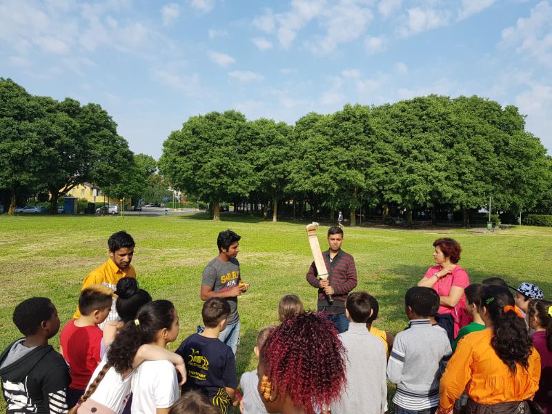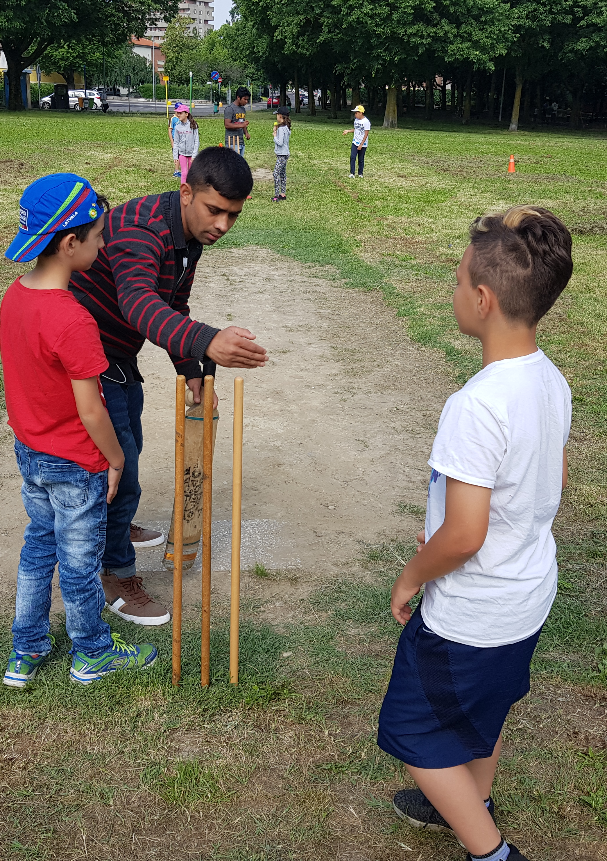 Armati di mazza, wicket (i piccoli paletti che delimitano la "porta") e palle hanno spiegato le regole e giocato insieme agli alunni di quattro classi. I bambini si sono misurati nel lancio, nella battuta e nell'eliminazione del battitore, tutti molto incuriositi da questo “strano sport” che pochi conoscevano per averlo visto in tv e per alcuni “somiglia un po' al baseball”, mentre per altri “non si capisce niente, meglio il calcio”. Ma alla fine il coro è stato praticamente unanime: il cricket è un sport molto divertente. Alla giornata hanno preso parte anche due ragazze nigeriane Irene e Joy richiedenti protezione internazionale ospiti della cooperativa l'Angolo che hanno aiutato ad allestire la postazioni ed hanno collaborato nella preparazione della merenda per i bambini. Giovedì 24 maggio si replica.