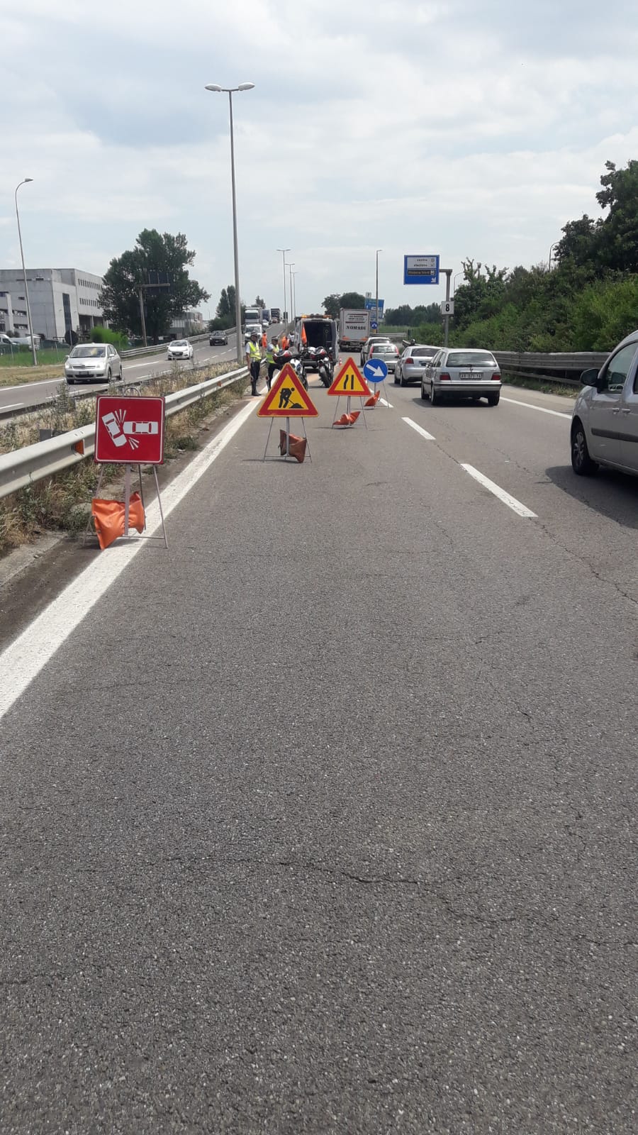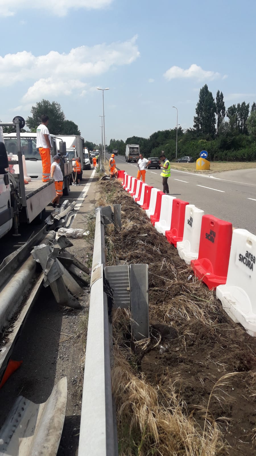 Verso le 12, coordinati dal Servizio Manutenzione dei Lavori pubblici del Comune, sono iniziati i lavori di messa in sicurezza provvisoria del guard rail, che hanno comportato l’asportazione del tratto incidentato e la collocazione temporanea di new jersy in plastica per separare le carreggiate di marcia della tangenziale. Nel primo pomeriggio I lavori hanno richiesto la chiusura di un breve tratto delle corsie di sorpasso di entrambe le direzioni di marcia, in prossimità dell’uscita 7. Poco dopo le 15 la situazione era completamente ripristinata e il traffico ha ripreso a scorrere regolarmente.