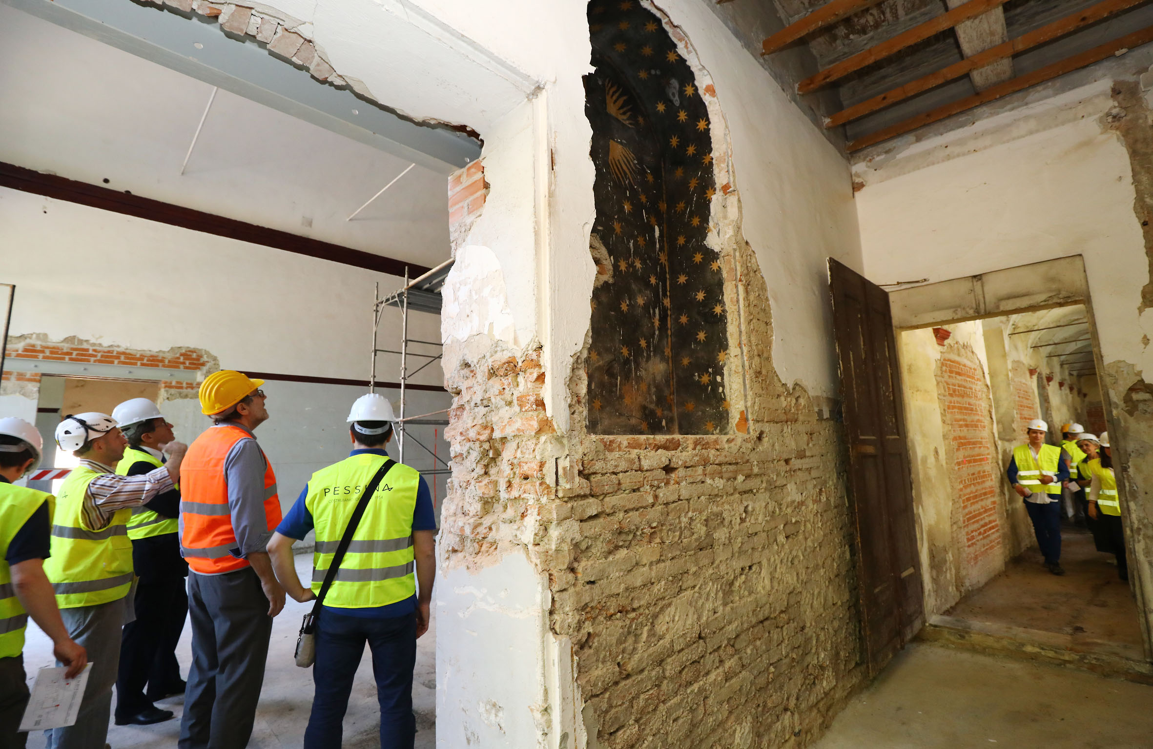 Nel corso del sopralluogo, hanno potuto verificare i lavori effettuati, in questa fase prevalentemente di demolizione e consolidamento ai piani terra e primo, e gli elementi emersi nel corso dell’intervento, come ad esempio al piano terra tra il futuro auditorium e il corridoio laterale a sud una nicchia con una pittura raffigurante il cielo stellato con una croce, che sarà sottoposta, nei prossimi giorni, all’attenzione della Soprintendenza ai Beni Architettonici e Paesaggistici Emilia Romagna.