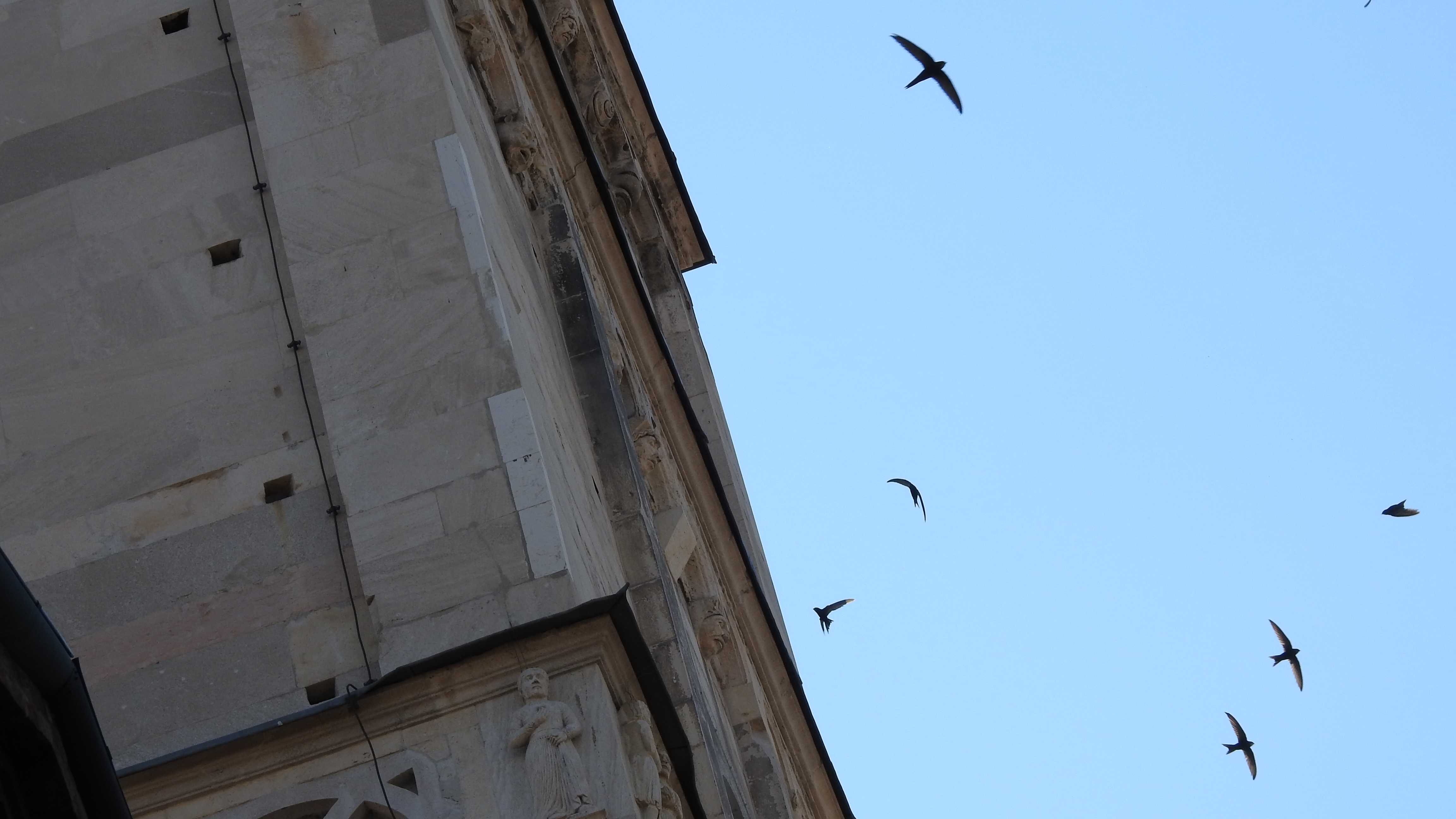 I rondoni sono piccoli uccelli migratori e insettivori che arrivano in città all’inizio di aprile e vi si trattengono per il tempo della riproduzione (circa tre mesi), arrivando a catturare circa ventimila insetti al giorno per alimentare i piccoli, poi volano nuovamente verso l’Africa. La Ghirlandina ospita anche altre piccole specie codirosso comune, codirosso spazzacamino, cinciallegra, passero oltre ai pipistrelli e, appunto, alla famiglia di falchi pellegrini, e questo anche grazie al restauro portato a termine nel 2012 nel corso del quale le 120 buche pontaie della torre sono state modificate in modo selettivo in modo da impedire l’accesso ai colombi ma non alle specie più piccole. La Ghirlandina è diventata quindi Monumento vivo e testimone concreto della biodiversità.
