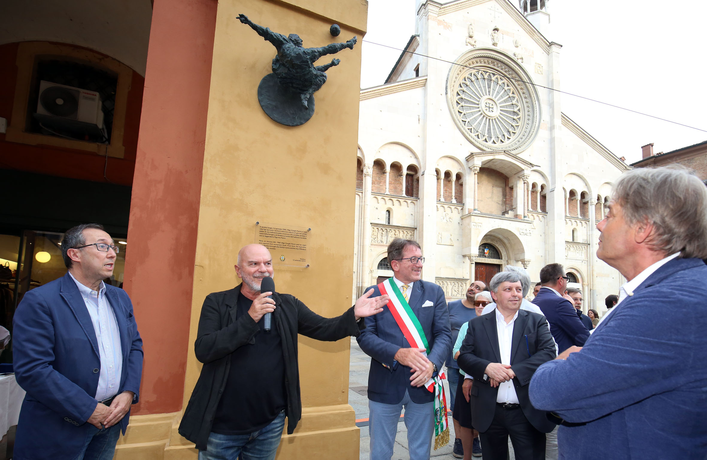 “In questo luogo, il 6 gennaio 1945, Olga Cuoghi Panini e i suoi otto figli aprivano i battenti della loro edicola di giornali, primo passo di una indimenticabile avventura che avrebbe portato il nome della famiglia e di Modena ai vertici dell’editoria mondiale con le leggendarie Figurine Panini”. Recita così la targa bilingue, in italiano e inglese, che d’ora in poi segnalerà a modenesi e turisti il luogo in corso Duomo a Modena dove c’era lo storico chiosco di giornali dei Panini e ora c’è invece una scultura dell’artista modenese Wainer Vaccari.