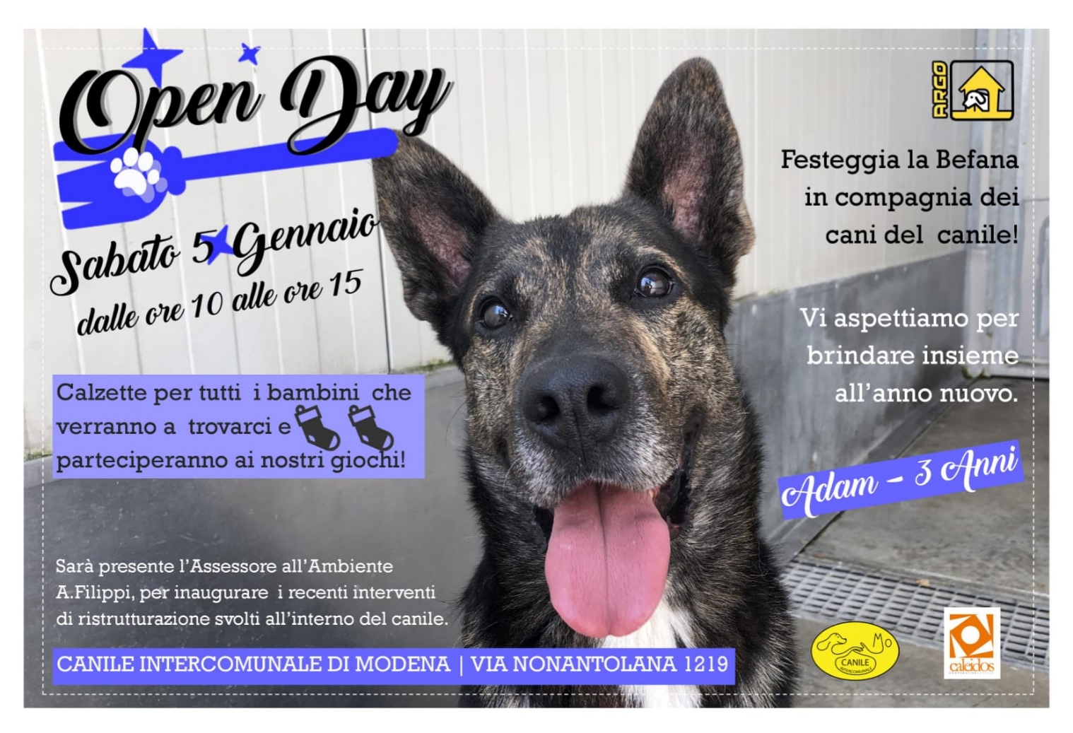 Giochi e calze della Befana per tutti i bambini, sabato 5 gennaio, al Canile intercomunale di via Nonantolana 1219 che, nel primo open day dell’anno nuovo, festeggia anche l’inaugurazione degli interventi di ristrutturazione terminati di recente.