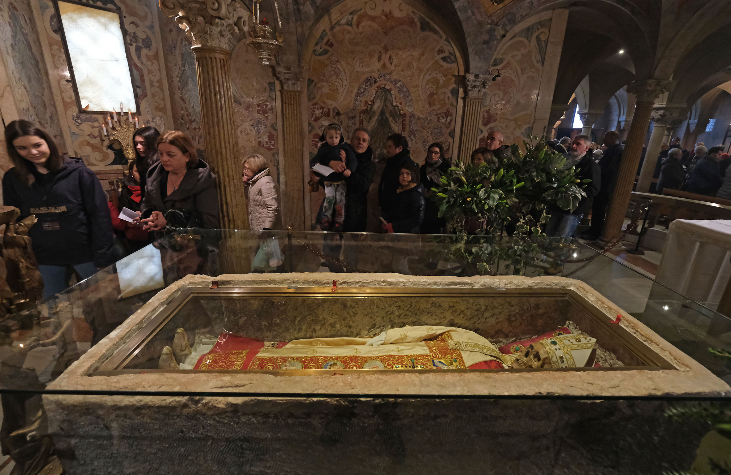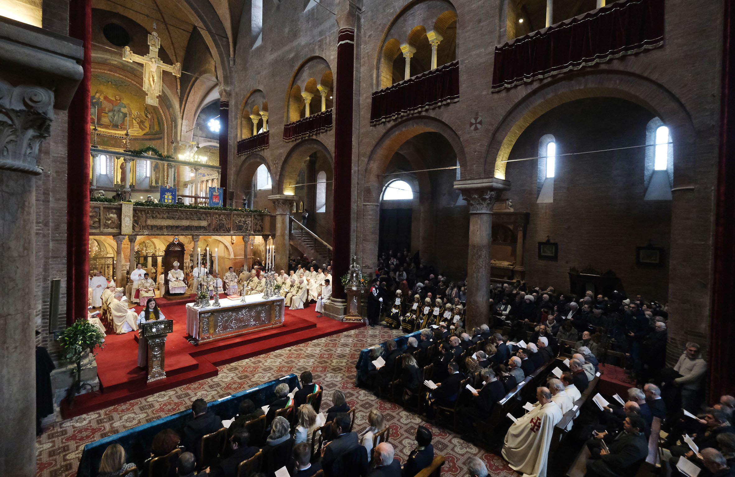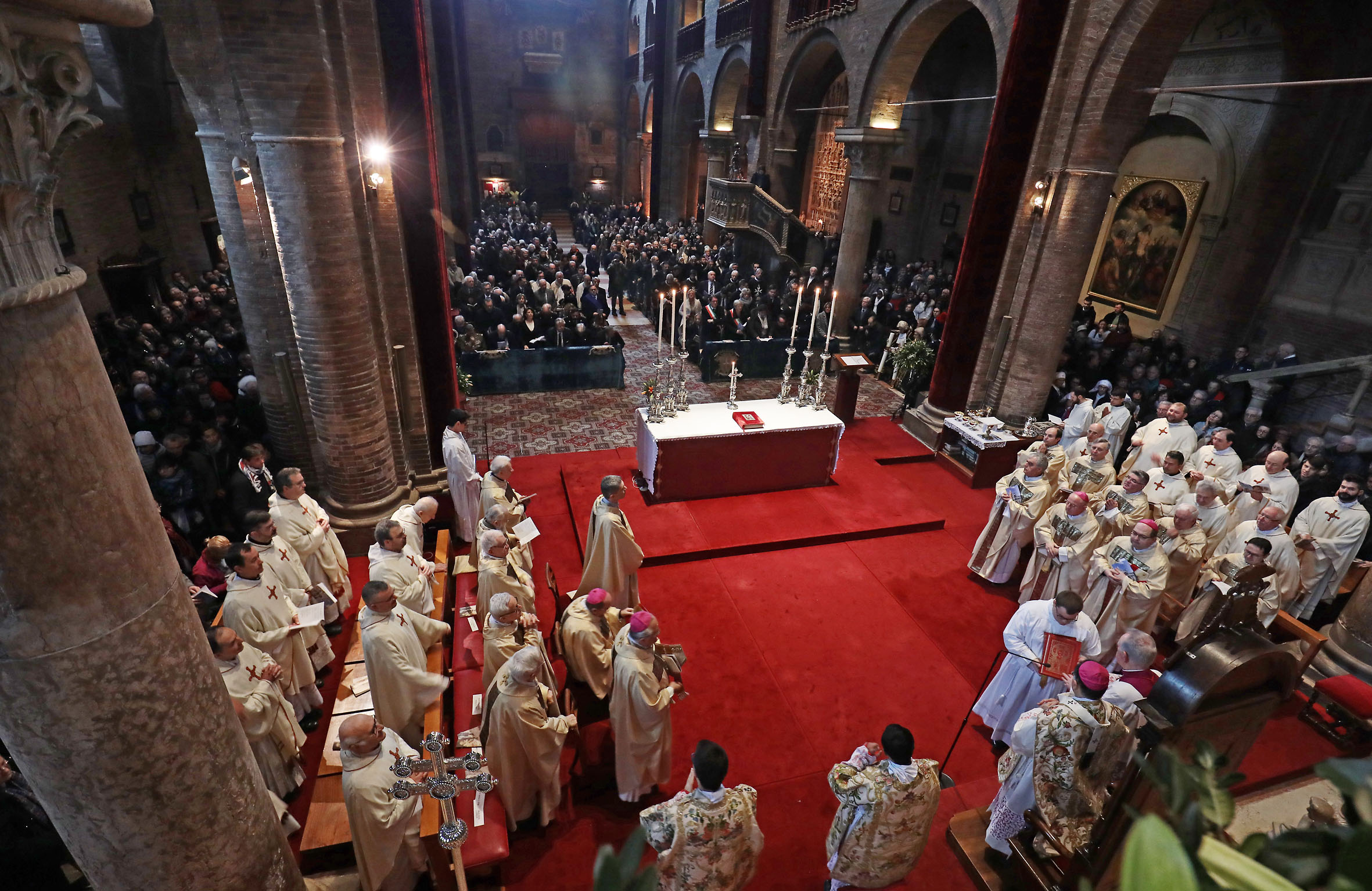 Il corteo ha raggiunto il Duomo, passando per via Emilia, con i valletti in livrea gialloblù a portare in offerta i ceri e l'olio per la lampada che nella cripta arde perennemente davanti al sepolcro del Santo Vescovo.