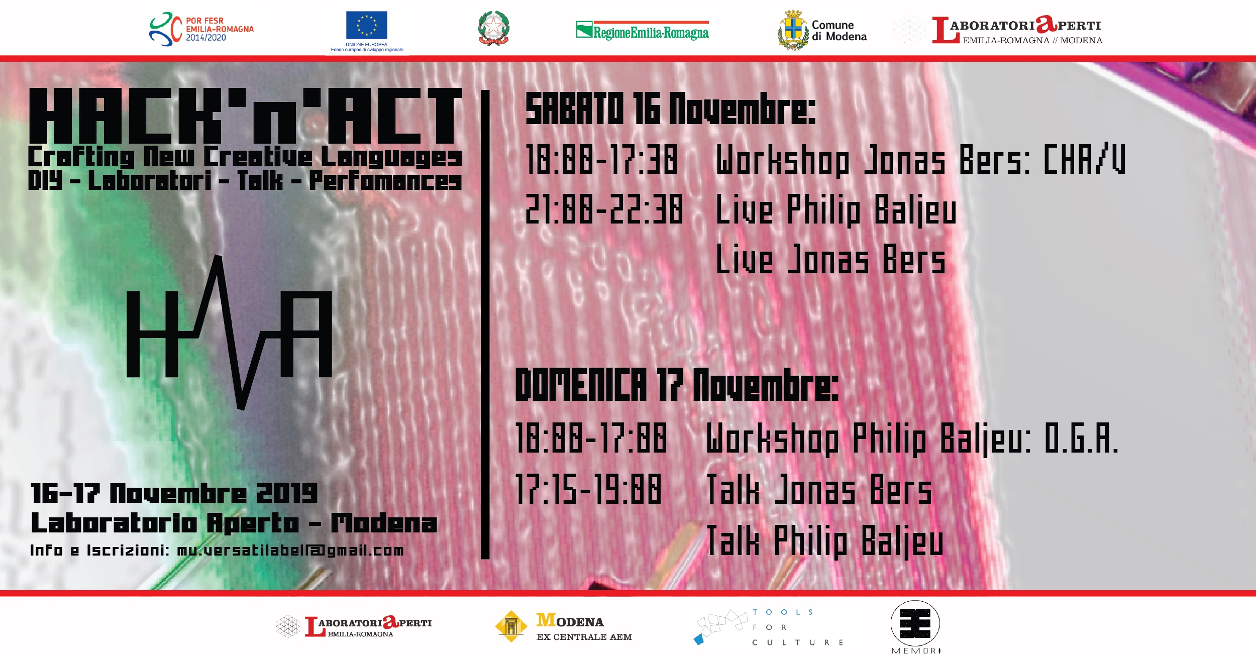 La due giorni, intitolata “Hack ‘n’ Act”, è organizzata dal Laboratorio Aperto in collaborazione con Memori e Tools for Culture e con il patrocinio del Comune di Modena. Sono previsti due workshop degli artisti (sabato 16 e domenica 17, dalle 10 alle 17.15), una loro performance aperta al pubblico (sabato 16 novembre, alle 21) e un talk di approfondimento su videosintetizzatori e tecniche utilizzate durante la performance (domenica 17 novembre, dalle 17.15 alle 19)