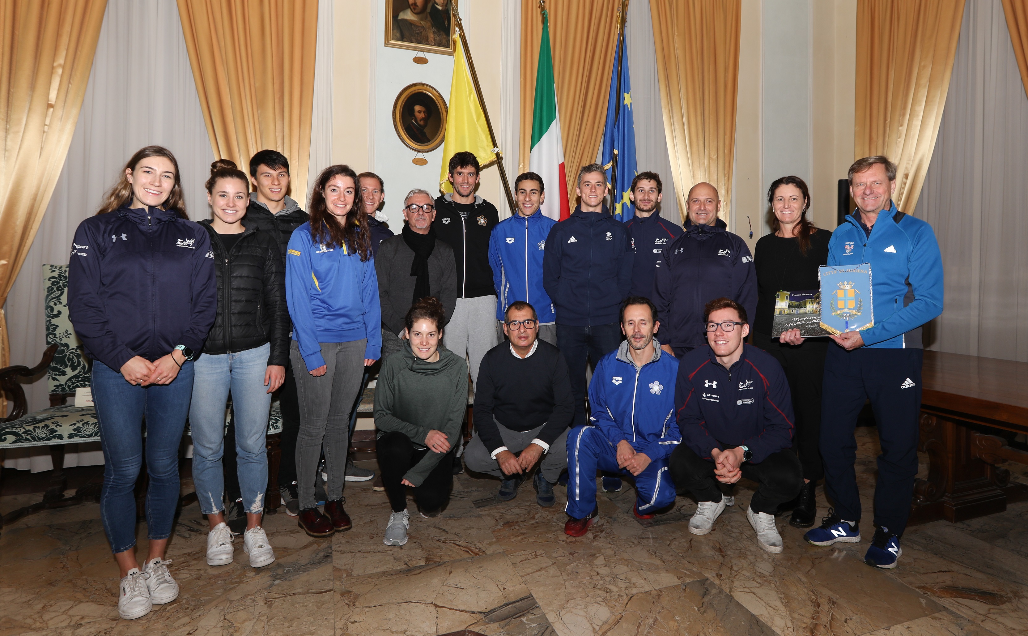 Gli atleti e le atlete della nazionale inglese di pentathlon moderno, a Modena per preparare la prossima stagione agonistica in vista delle Olimpiadi di Tokio 2020, sono stati ricevuti oggi, martedì 12 novembre, in Municipio, dall’assessora allo Sport Grazia Baracchi e dal rappresentante provinciale del Coni Andre Dondi che hanno portato alla squadra il saluto della città.
