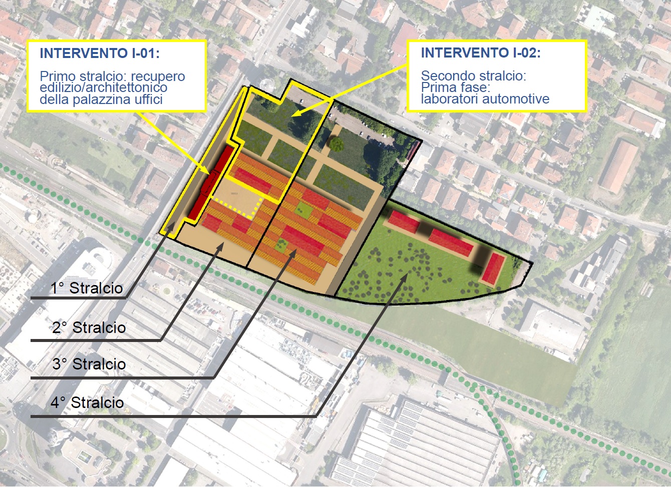 Con il primo stralcio si interviene sulla palazzina, che diventerà sede dell’Istituto storico, nel cosiddetto “rettangolo del Novecento”, luogo della storia e di un’identità legata al mondo del lavoro, in stretta connessione con il “quadrato dell’Innovazione”, dove il recupero delle architetture industriali si svilupperà in fasi successivi, nel secondo e terzo stralcio, man mano che si presenteranno opportunità e occasioni per realizzare uffici e laboratori di ricerca, con spazi flessibili e modulari, dedicati alle tecnologie applicate all’automotive, in stretta connessione con il progetto Masa (Modena automotive smart area), l’Autodromo e le iniziative riferite alla Motor Valley.