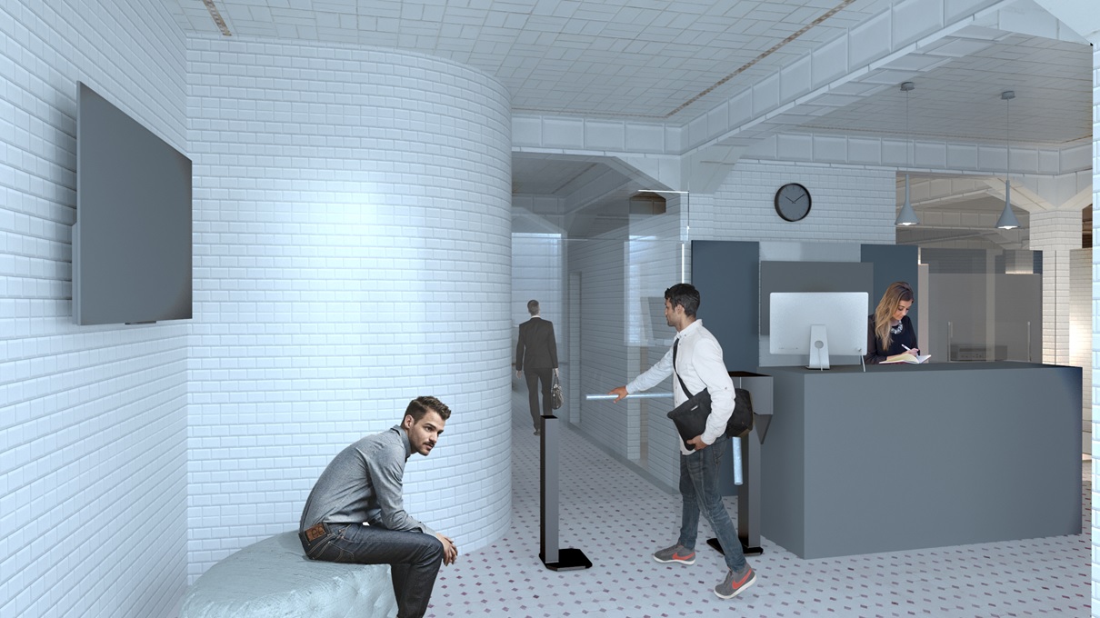L’accesso alla struttura sarà quello esistente ma con un ascensore con cabina in vetro e una nuova scala, con una nuova organizzazione dei gradini. L’atrio dell’ingresso viene ampliato e la zona sarà caratterizzata da superfici vetrate per l’illuminazione naturale diurna.