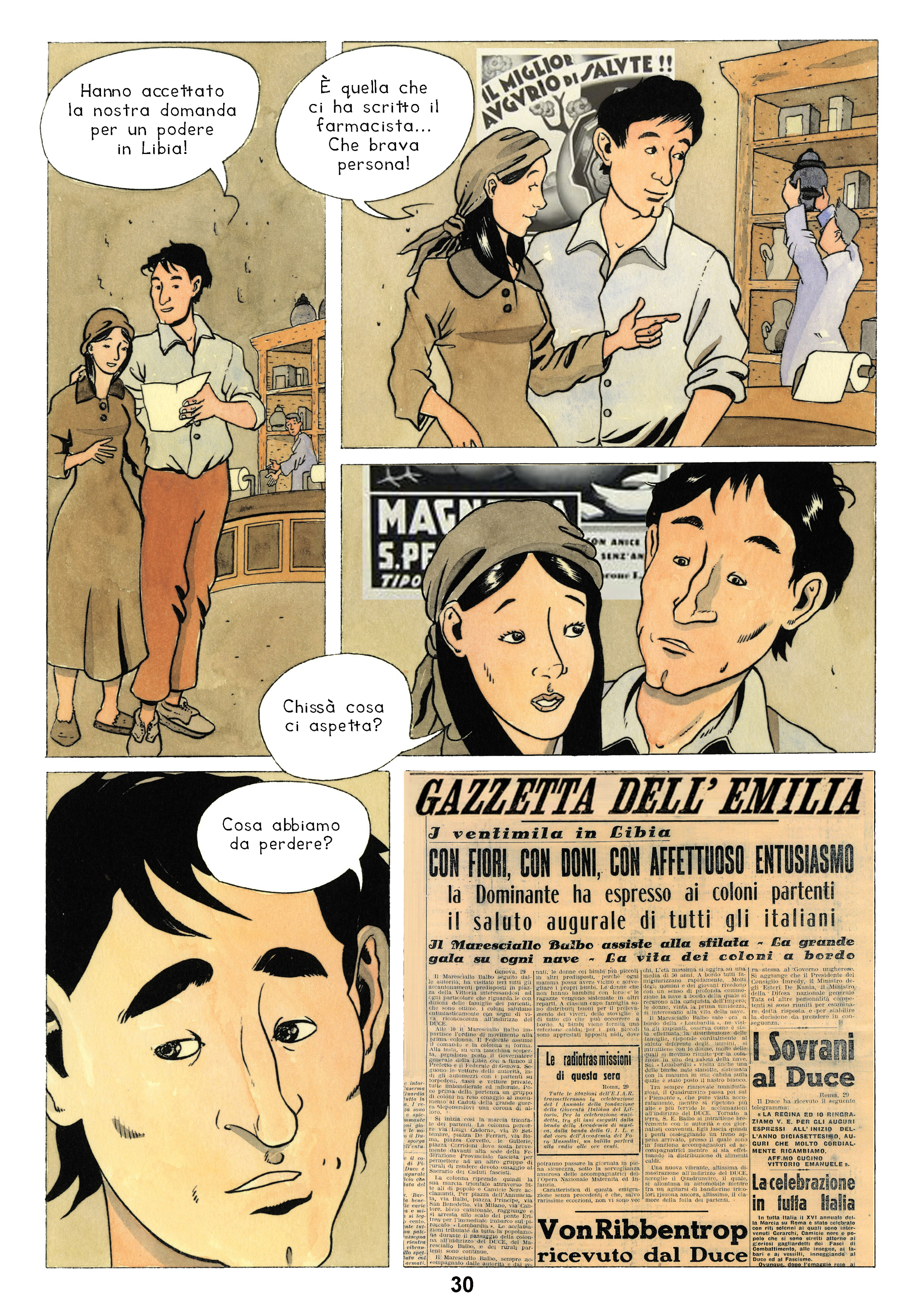 In esposizione 40 pannelli tratti dal fumetto "Tripoli bel suol d'amore", nato dalla collaborazione di Mattia Nicolini e di Celso Braglia dell’Associazione onlus Avec, che hanno ideato e realizzato testi e disegni a partire da materiale documentario dell'epoca, recuperando fonti fotografiche e alcuni diari, depositati presso l'Archivio Diaristico Nazionale di Pieve Santo Stefano, scritti durante il fascismo da figli di coloni in Libia.