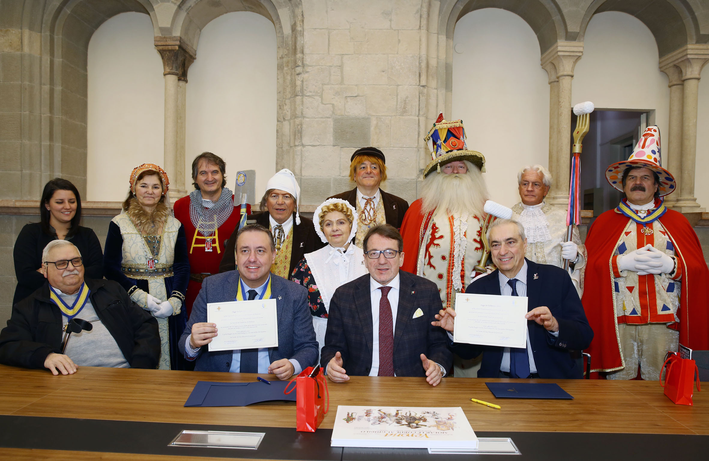 Le colorate maschere popolari del Carnevale di Verona, guidate dal Papà del Gnocco e dal principe Can Grande, hanno omaggiato il Comune con un libro sulla loro storia e una confezione degli “gnocchi di Verona” per uno scambio all’insegna della gastronomia, oltre che del Carnevale a cui le maschere veronesi parteciperanno anche quest’anno a Modena, come ormai da 35 anni.