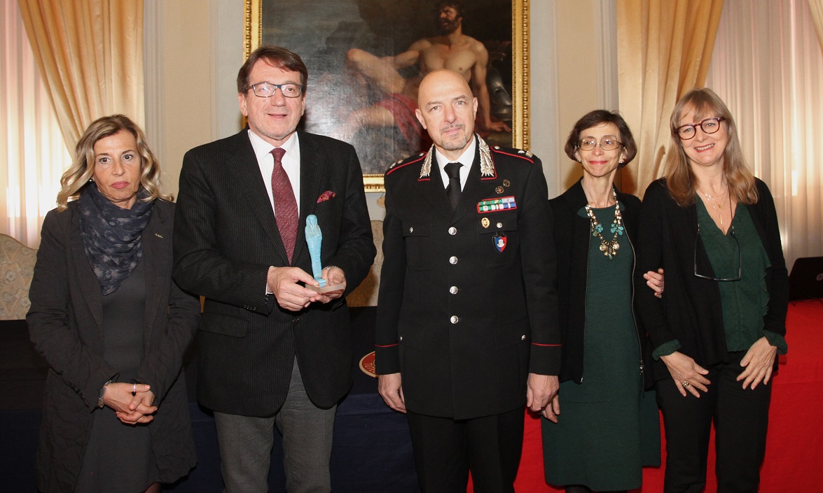 È una felicissima coincidenza quella della restituzione di un reperto egizio che era stato rubato 55 anni fa, proprio mentre è in corso ai Musei civici di Modena la mostra della raccolta a cui apparteneva. Una statuetta egizia “ushabti” in faience (maiolica) del VI secolo a.C. (XXVI dinastia) è stata recuperata dai Carabinieri del Nucleo tutela del patrimonio culturale di Bologna comandati dal maggiore Giuseppe De Gori. Il maggiore, venerdì 15 marzo a Palazzo Comunale, l’ha riconsegnata al sindaco di Modena Gian Carlo Muzzarelli e alla direttrice dei Musei Francesca Piccinini, alla cerimonia con Cristiana Zanasi, curatrice della mostra “Storie d’Egitto”, dove l’oggetto sarà esposto da sabato 16 marzo. Nell’occasione erano presenti il Procuratore della Repubblica Lucia Musti e il tenente colonnello Stefano Nencioni, comandante del Reparto operativo del Comando Provinciale Carabinieri di Modena e Daniela Picchi, curatrice della sezione egizia del Museo civico Archeologico di Bologna.