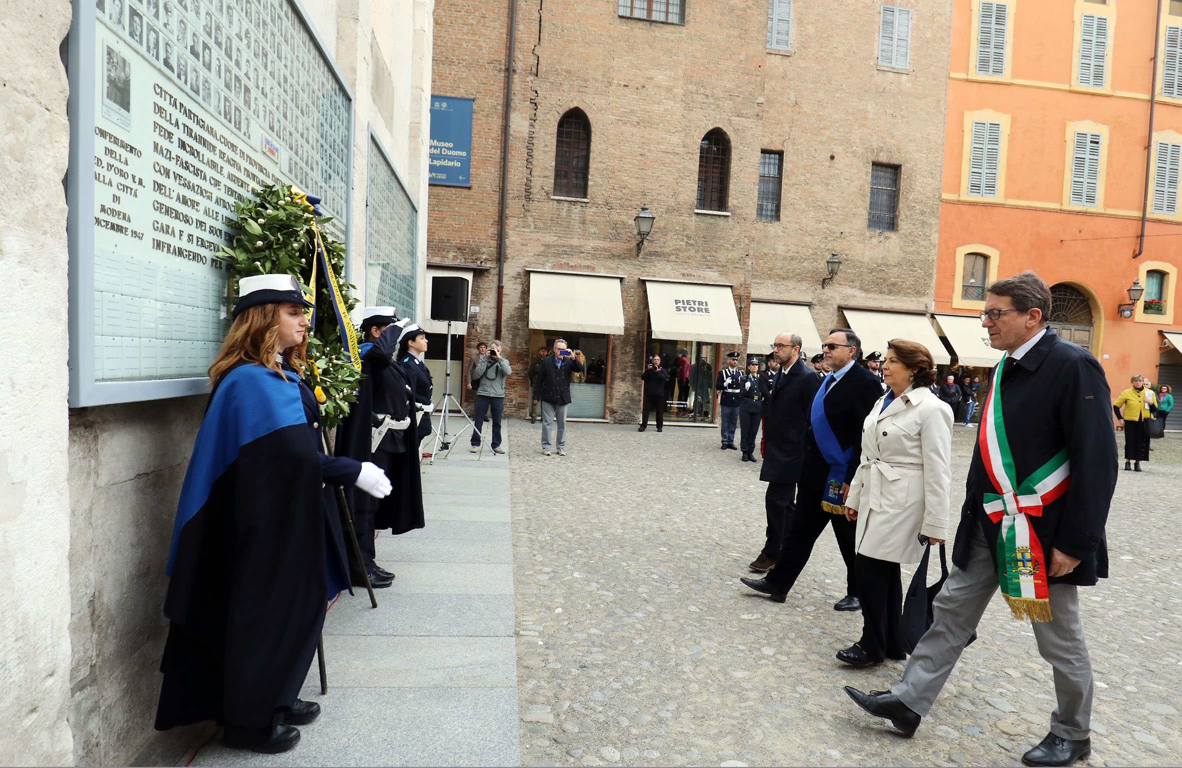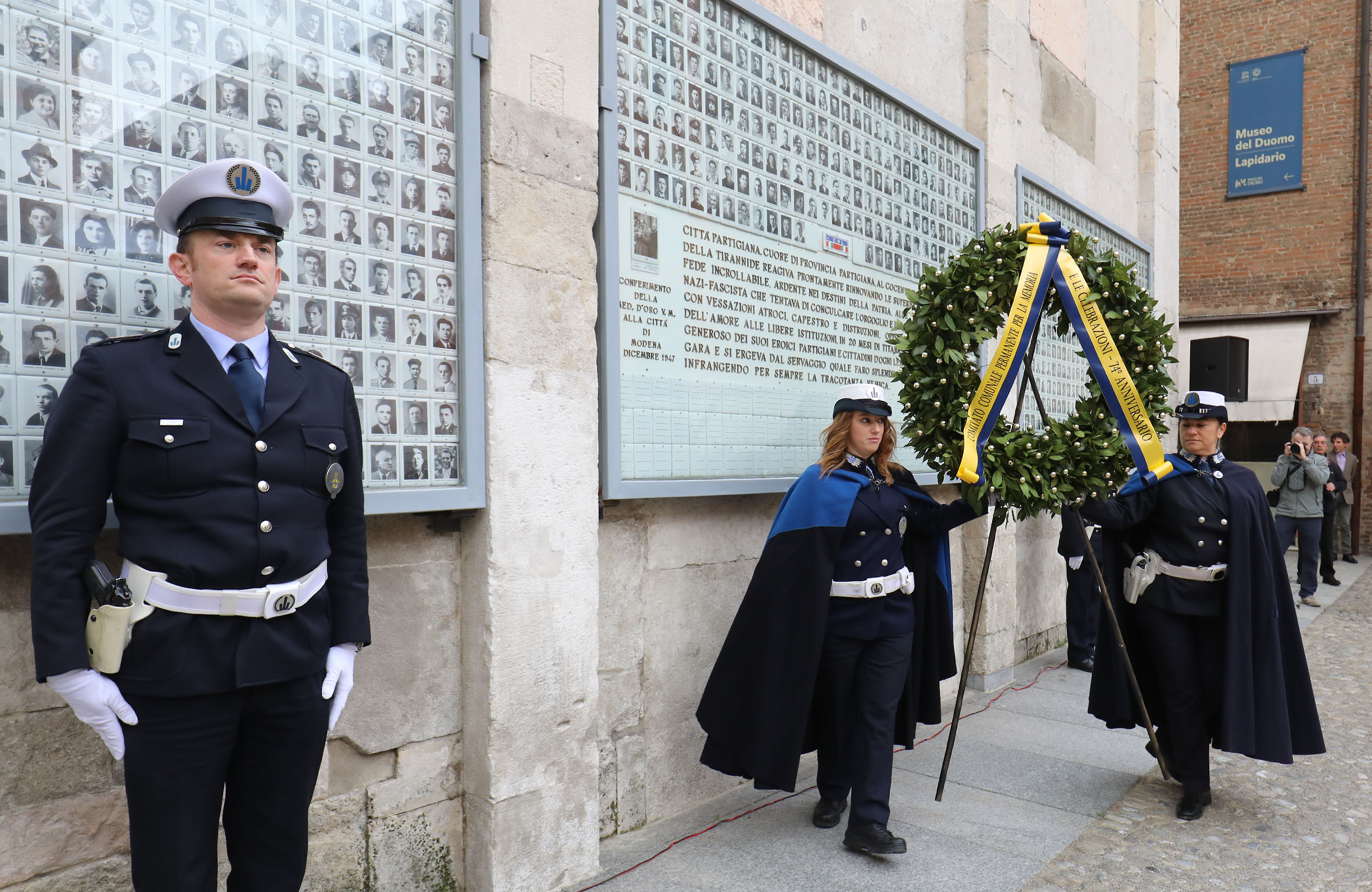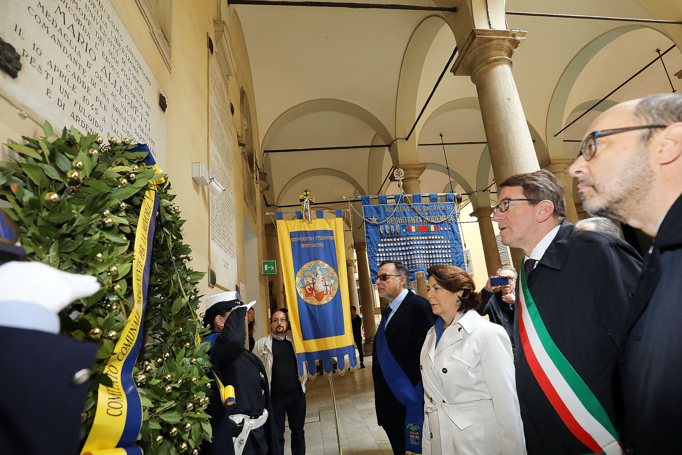 Le cerimonie di lunedì 22 aprile si sono aperte, con la partecipazione delle autorità cittadine e della banda, al cimitero di San Cataldo con la deposizione di una corona al Famedio per proseguire al Sacrario della Ghirlandina e quindi alla lapide a ricordo degli ex internati militari. Dopo l’omaggio alla lapide della Medaglia d’Oro alla Città di Modena, in cima allo scalone del Palazzo comunale in piazza Grande, è stata deposta una corona alla lapide in ricordo di Mario Allegretti, medaglia d’oro al valor militare, nell’atrio dell’Ateneo in via Università.