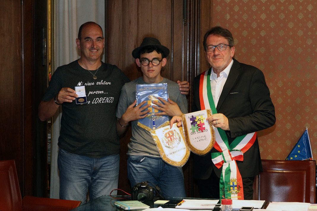 “Un saluto per dare dignità”. È questo il motto che guida il viaggio di Lorenzo Cardone, diciannove anni, affetto da autismo, e del padre Franco al loro terzo itinerario lungo l’Italia con l’obiettivo di far conoscere l’autismo e abbattere le barriere tra le persone, magari solo attraverso un saluto anche a chi non si è mai visto prima. A Lorenzo, come c’è scritto sulle sue magliette, piace salutare tutte le persone che incontra, e, in qualità di “ambasciatore del saluto”, è stato accolto questa mattina, martedì 18 giugno, in Municipio a Modena dal sindaco Gian Carlo Muzzarelli e da tutta la giunta comunale.