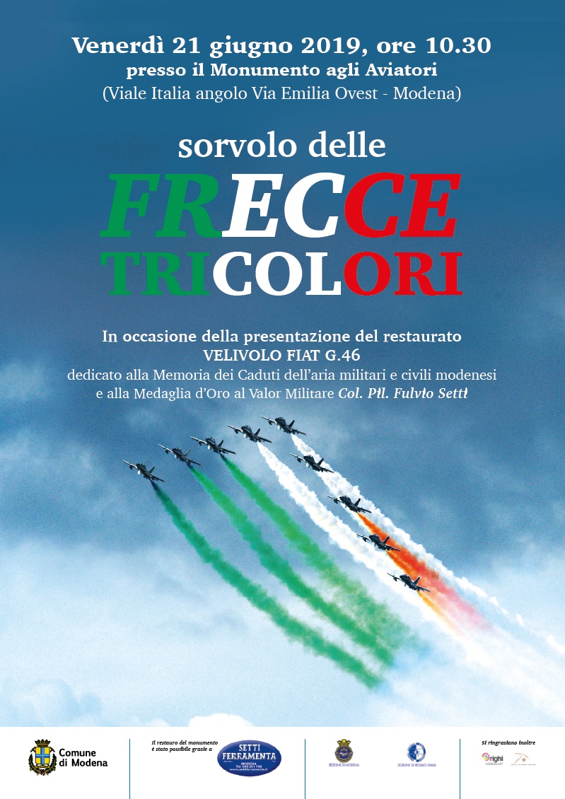 Saranno le Frecce Tricolori a rendere omaggio venerdì 21 giugno a Modena al monumento restaurato dedicato al colonnello pilota Fulvio Setti, medaglia d'oro al valor militare, e “ai caduti dell'aria modenesi militari e civili”. Il monumento degli Aviatori si trova all'incrocio tra la via Emilia ovest e viale Italia, al limite dell'area del parco Ferrari dove si sviluppava l'Aerautodromo di Modena, ed è realizzato utilizzando un esemplare di aeroplano da addestramento, un Fiat G46 prodotto tra il 1948 e il 1952, un biposto in uso anche all'Aeroclub modenese fino al 1972. Prima del sorvolo della città da parte delle Frecce, venerdì sarà proprio un esemplare di Fiat G46 del tutto uguale a quello del monumento ad attraverso il cielo di Modena in un’esibizione insieme ad altri velivoli storici.