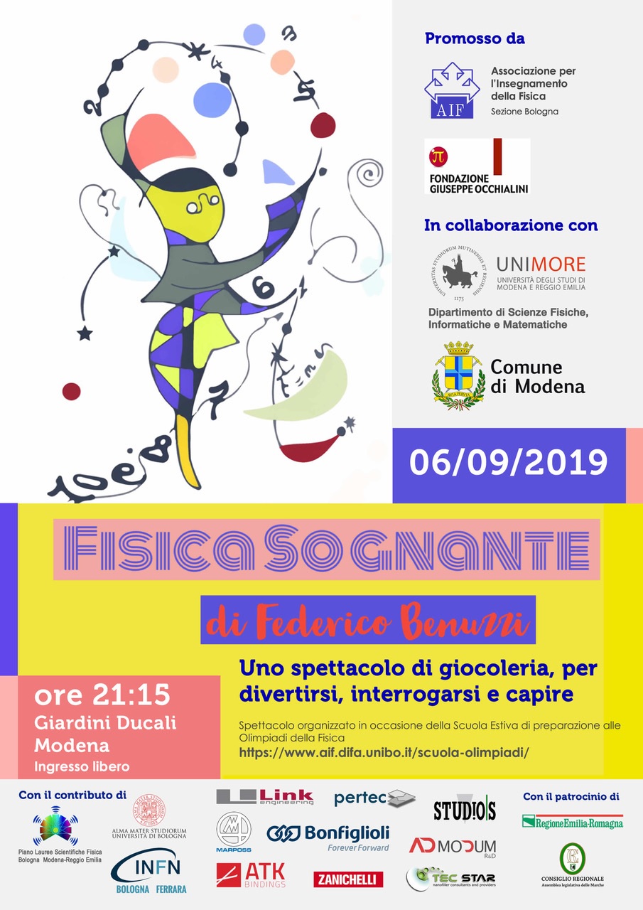 Lo spettacolo di venerdì 6 settembre ai Giardini chiude in maniera divertente e intelligente insieme l’esperienza della scuola residenziale interregionale di preparazione alle Olimpiadi della Fisica, OliFis ER-Marche, che ha visto protagonista e sponsor il Dipartimento di Scienze Fisiche, Informatiche e Matematiche (Fim) di UniMoRe, e si è svolta sull’Appenino modenese al Centro Tabor di Gaiato, nel comune di Pavullo nel Frignano (in provincia di Modena).