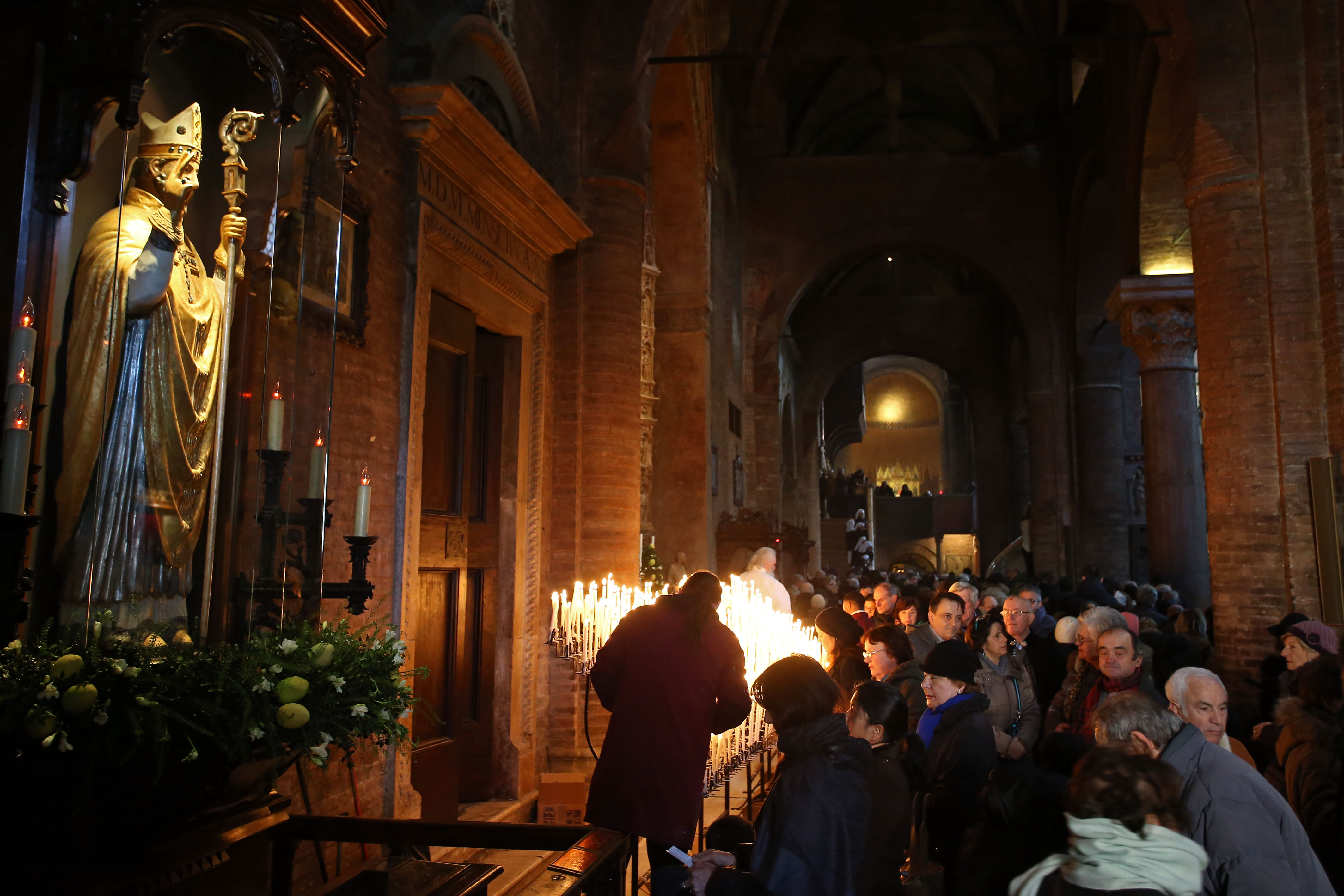 Alle 10.30, dallo scalone del Palazzo comunale, si muoverà il corteo con i valletti in livrea gialloblù a portare in offerta i ceri e l'olio per la lampada che nella cripta del Duomo arde perennemente davanti al sepolcro del Santo Vescovo, scoperto in occasione della festa per la devozione e le preghiere dei fedeli.