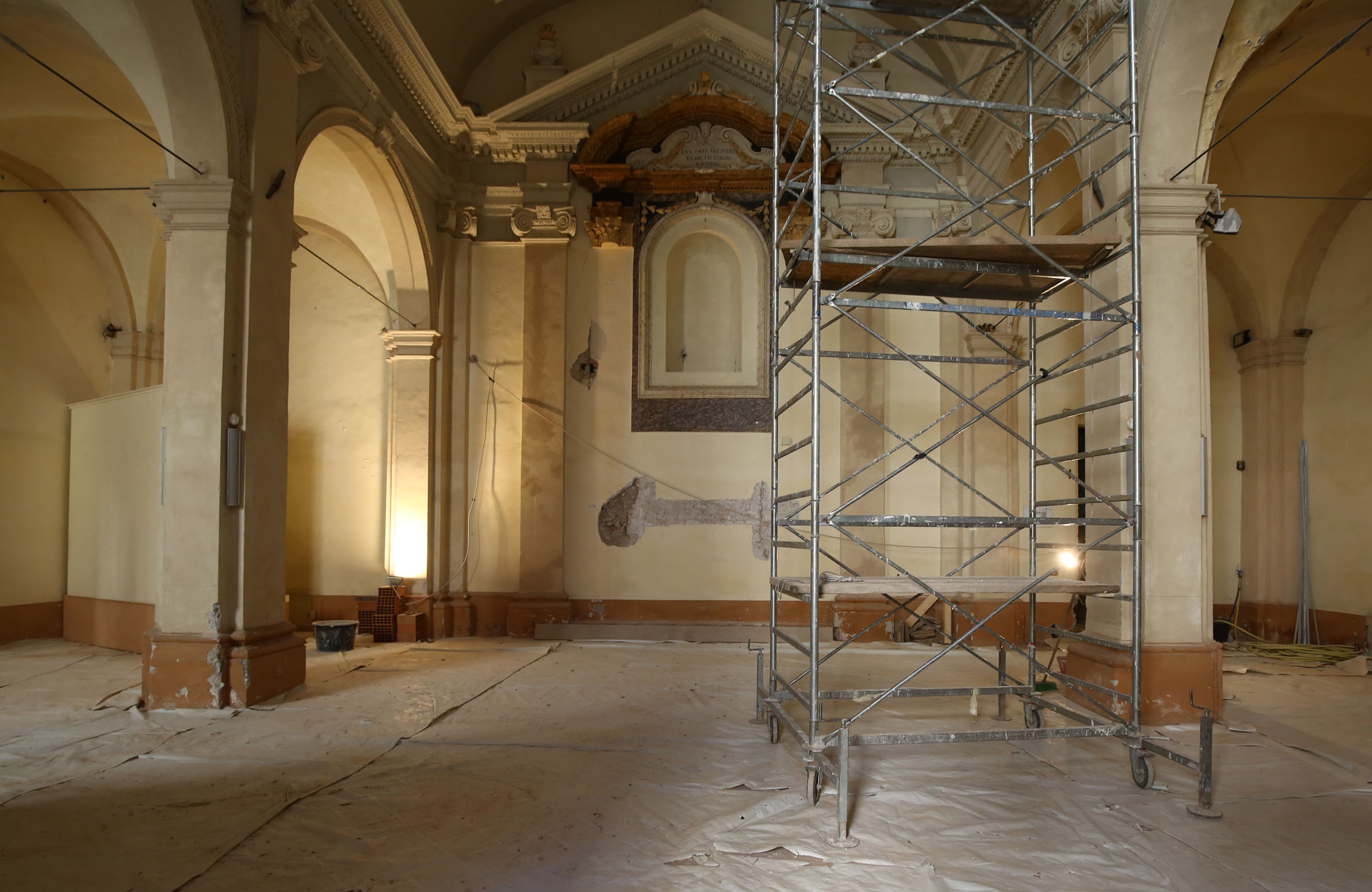 Gli interventi strutturali previsti in progetto e relativi in particolare al consolidamento e miglioramento sismico delle coperture, all’inserimento di tiranti metallici e al consolidamento delle volte in muratura sono pressoché ultimati e sono in corso gli interventi di adeguamento funzionale e impiantisco che, nell’Oratorio, saranno effettuati in seguito allo smontaggio del ponteggio interno, dopo il completamento degli interventi di restauro pittorico. Oltre ai lavori strettamente legati ai danni del sisma, infatti, l’intervento comprende anche attività di restauro, rinnovo di impianti e finiture per consentire il pieno utilizzo delle strutture.