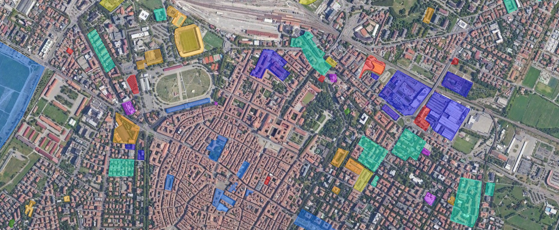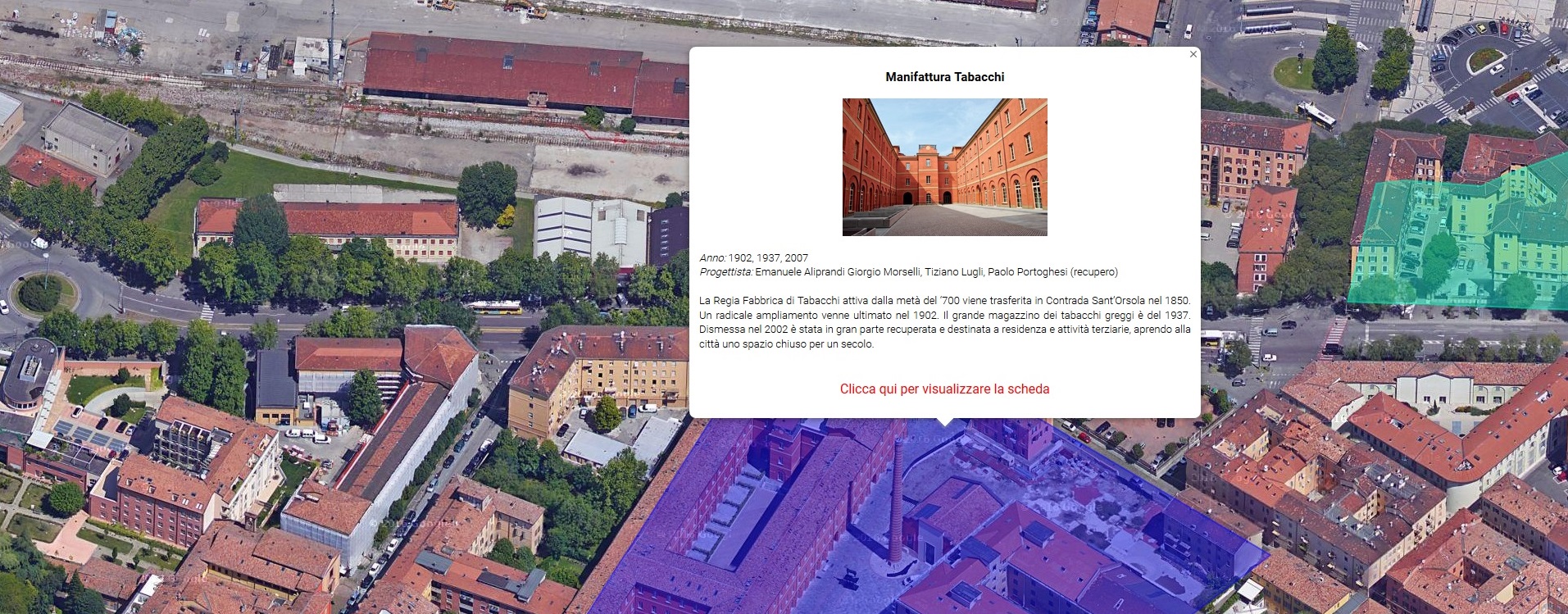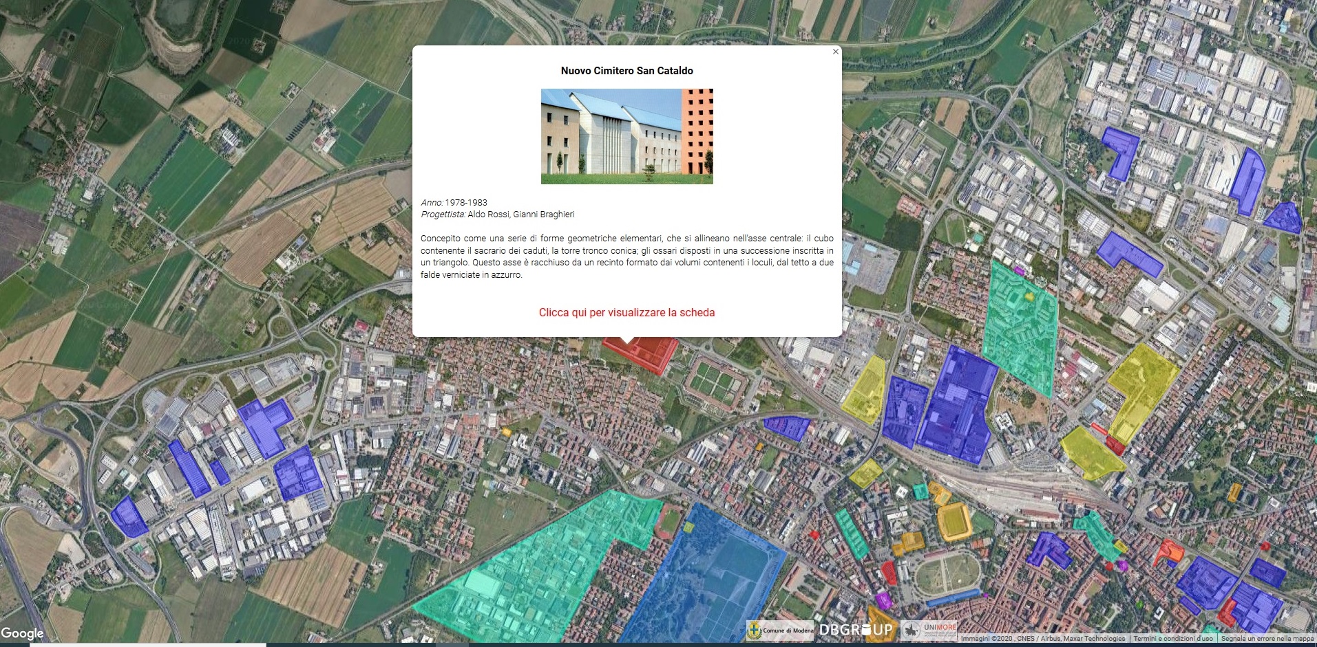 Attraverso la mappa digitale sono ora accessibili a tutti le schede di oltre 100 edifici e luoghi rappresentativi della nuova città storica e di quella contemporanea pubblicati nei volumi Città e architetture (2012) e Città e architetture industriali (2016), editi da Franco Cosimo Panini. Sulla base cartografica di Google Maps, utilizzando lo zoom sono visibili nella mappa poligoni di diverso colore, che indicano edifici e luoghi della città di Modena. Cliccando su quelli si apre una finestra con indicazione sintetica e immagine dell’edificio selezionato. Da qui è poi possibile accedere direttamente alla sua scheda di approfondimento disponibile sul sito.