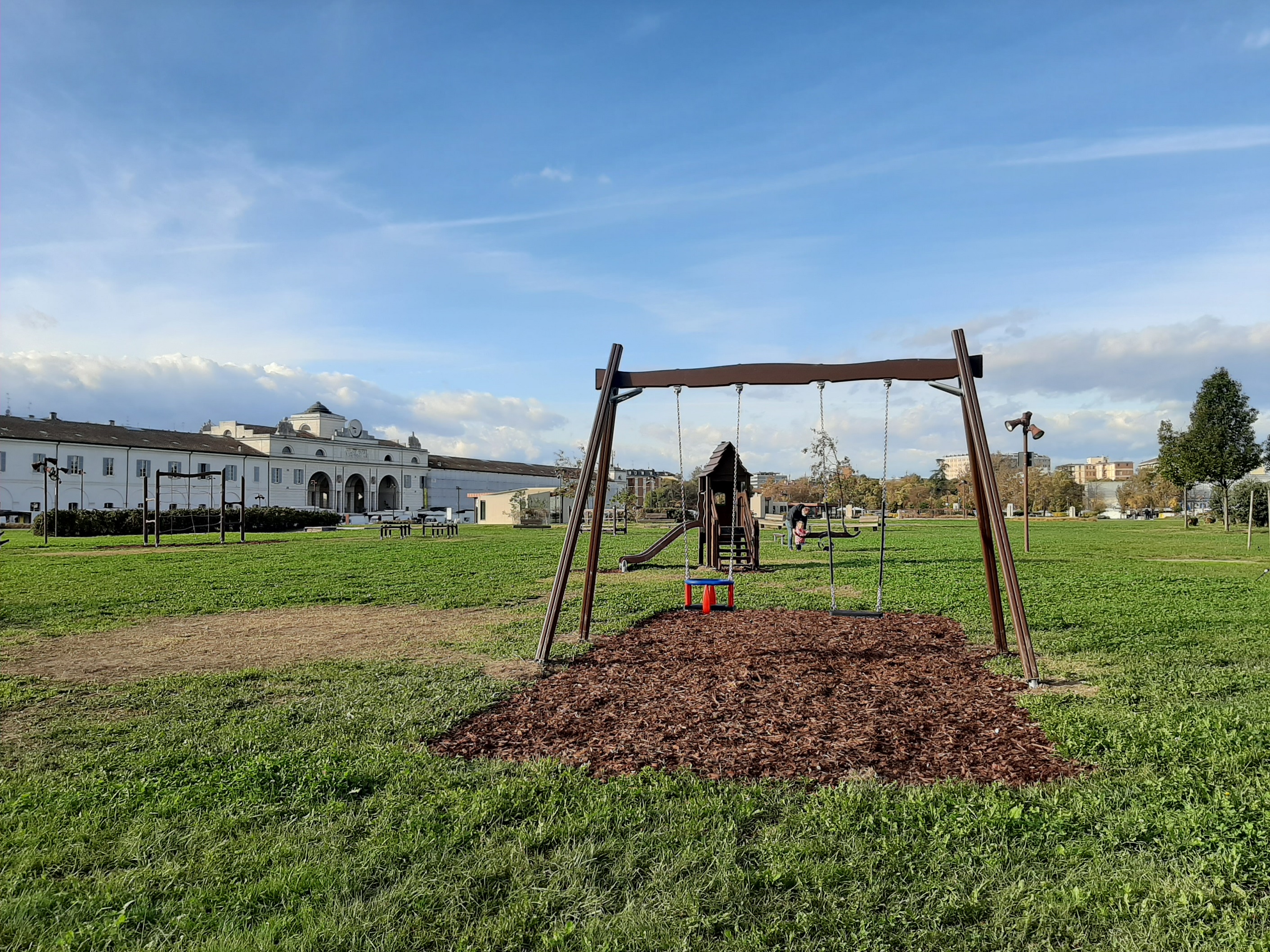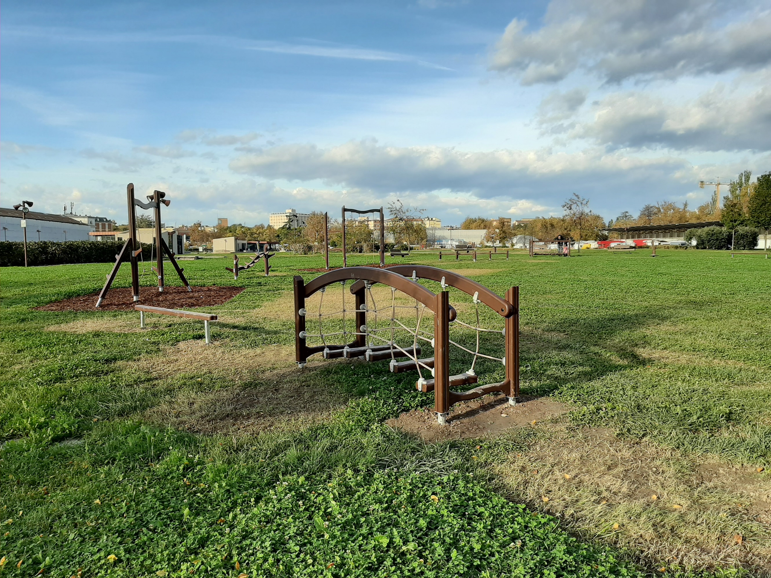 Entrando nel dettaglio, lo spazio gioco per i bambini e quello per la pratica di esercizi sportivi all’aperto sono collocati ai lati opposti del parco, con installazione direttamente sul prato, e dal punto di vista progettuale sono stati realizzati con attrezzature di disegno semplice in legno e acciaio, prive di colorazioni impattanti. In particolare, l’area gioco è posizionata tra il margine della pista nella curva al lato nord-est, verso viale Fontanelli e nella direzione di corso Cavour. Dodici gli attrezzi ludici installati in sequenza, a partire dall’ingresso individuato da un ponticello a pioli, per formare un percorso di gioco, divertimento, avventura con diverse travi d’equilibrio, strutture per il climbing e un secondo ponte tibetano che segna l’accesso ai giochi per i più piccoli, adatti all’uso prolungato.