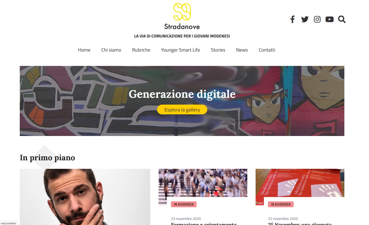 Stradanove è un progetto lanciato nel 1997 e, da allora, rivolgendosi in prevalenza a un pubblico giovanile, propone contenuti che promuovono protagonismo e creatività. Tra le varie sezioni presenti, l'area sulla consulenza online affronta tematiche delicate come la sessualità, le nuove forme di tossicodipendenza, il bullismo, il gioco d'azzardo, la sicurezza stradale e la sicurezza in internet. I giovani interessati, in maniera anonima, possono inviare domande, richieste di approfondimento e ottenere una risposta dal gruppo di esperti del quale si avvale la redazione. Stradanove, infatti, collabora con tutti i servizi istituzionali per i giovani presenti sul territorio comunale e provinciale, grazie a un apposito coordinamento e con un grande numero di realtà associative, con le quali sono condivisibili obiettivi e metodologie. Tra gli altri argomenti di cui tratta STradanove ci sono anche i temi della cittadinanza attiva (Servizio civile e YoungERcard principalmente) e la ricerca attiva del lavoro, orientamento e formazione, a cui si collega il progetto “Comunità Maiuscole”.