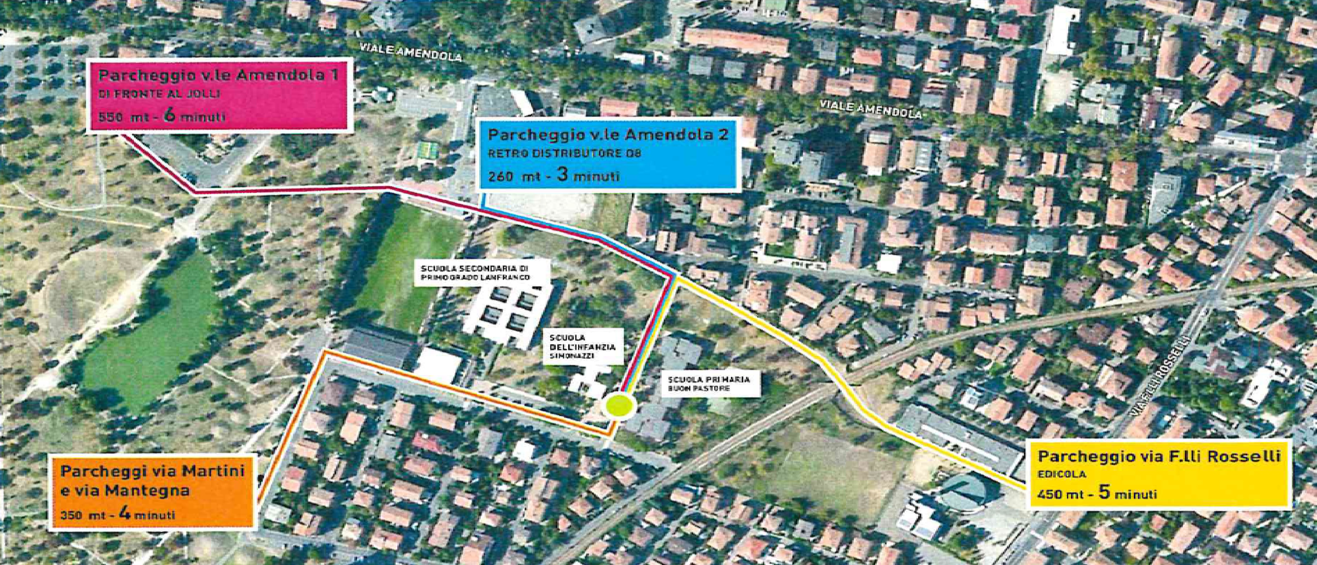 Chi ha necessità di recarsi nell’area per accompagnare i bambini a scuola può lasciare l’auto in uno dei parcheggi di prossimità disponibili: il parcheggio viale Amendola 1 di fronte al centro sportivo (550 metri, 6 minuti), il parcheggio viale Amendola 2, nel retro dell’impianto distributore carburante (260 metri, 3 minuti), i parcheggi in via Martini e via Mantegna (350 metri, 4 minuti) e il parcheggio in via Fratelli Rosselli (450 metri, 5 minuti).