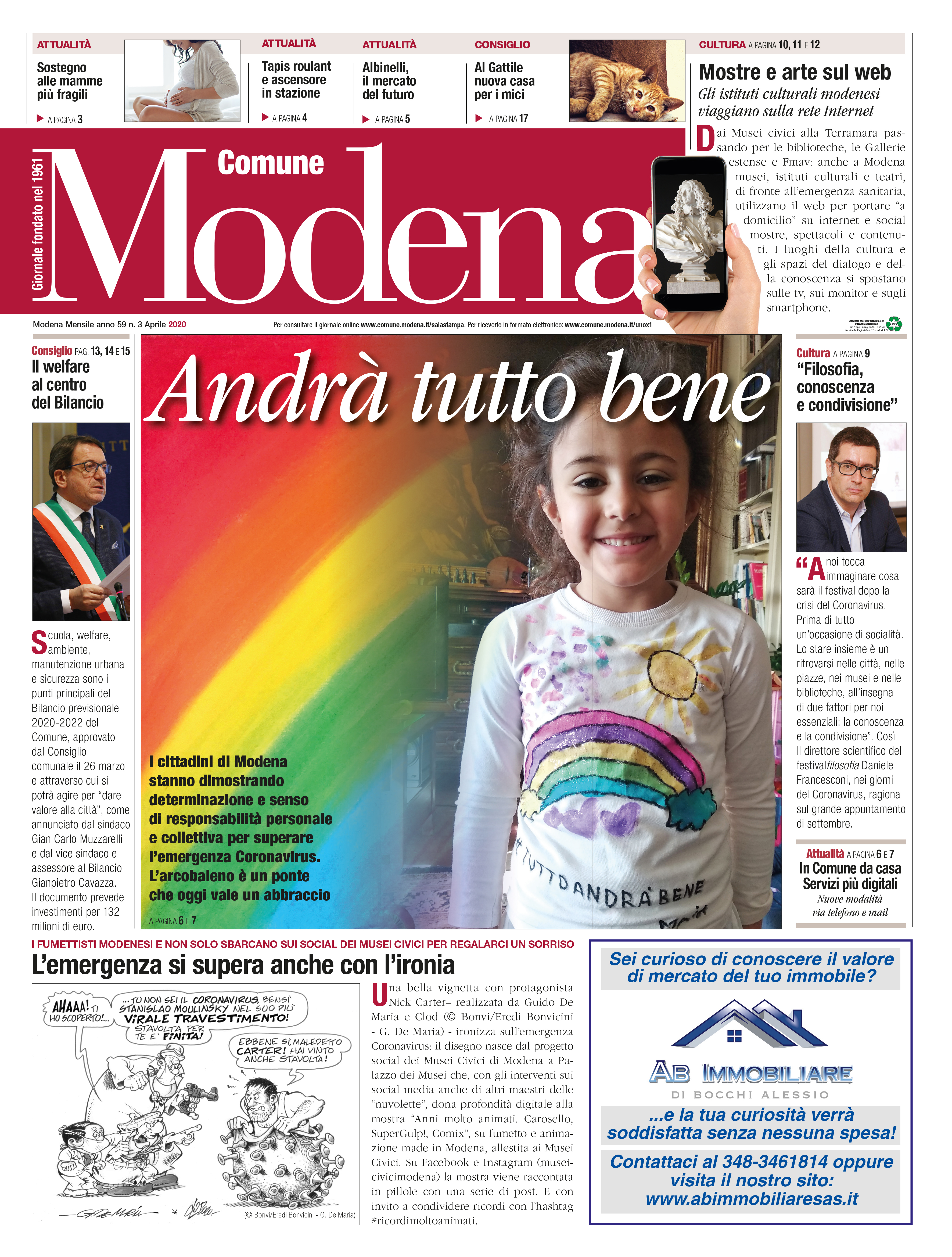 In primo piano una bambina sorridente, avvolta in un arcobaleno che sembra un abbraccio, e nel titolo l’auspicio che riempie le nostre giornate: “Andrà tutto bene”. In prima pagina del periodico, da mercoledì 1 aprile scaricabile dal sito del Comune (www.comune.modena.it/salastampa), porta anche un po’ d’ironia una vignetta di Nick Carter realizzata da Guido De Maria e Clod, mentre le pagine di cultura raccontano come l’arte si sia “riconvertita” su internet. Musei, istituti culturali e teatri, infatti, utilizzano la Rete per portare “a domicilio” sul web e sui social network mostre, spettacoli e contenuti. Sempre online trova nuovi orizzonti l’edizione digitale 2020 di Motor Valley Fest in calendario a maggio, e al Centro Musica si programmano forme di produzione e formazione per giovani musicisti della regione.