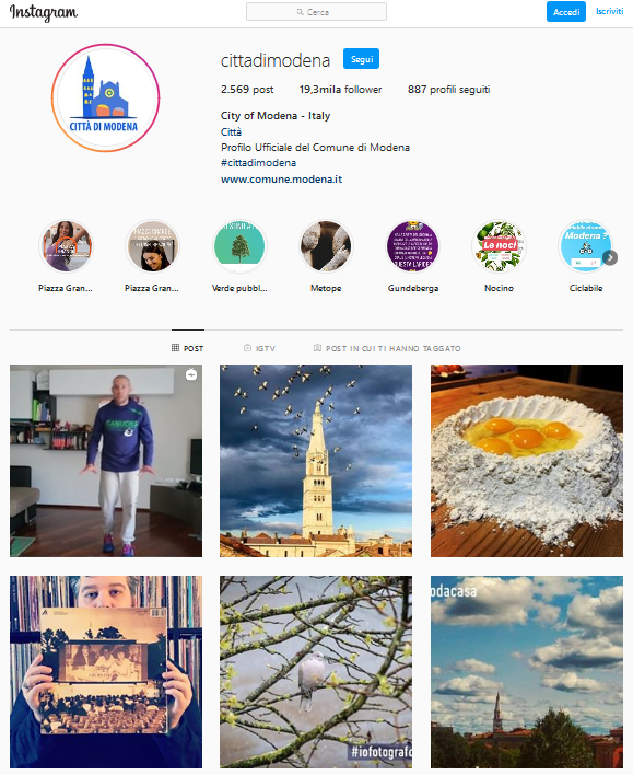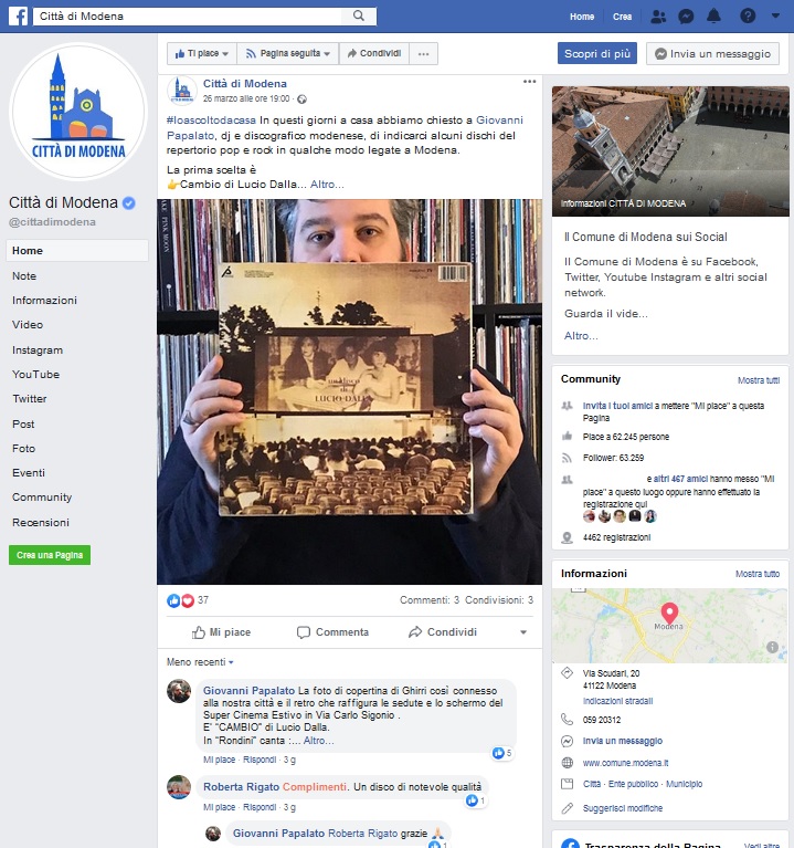 Ci sono i selfie e i video di modenesi che aderiscono alla campagna #iorestoacasa, ovviamente con l’hashtag, e c’è il consiglio di Sandrone in dialetto. Ma ci sono pure i filmati sulla ginnastica da svolgere davanti al tablet e le carrellate fotografiche di pietanze cucinate, dischi ascoltati e libri letti nelle case della città. Le nuove forme di comunità passano anche dai canali social del Comune di Modena: oltre a trasmettere l’impegno a rimanere nella propria abitazione nel rispetto delle prescrizioni sul Coronavirus, le piattaforme 2.0 costituiscono un luogo di riferimento e di ritrovo per tanti cittadini che online interagiscono costruendo una comunità sempre più interconnessa e “concreta”. Una piazza virtuale che diventa reale.