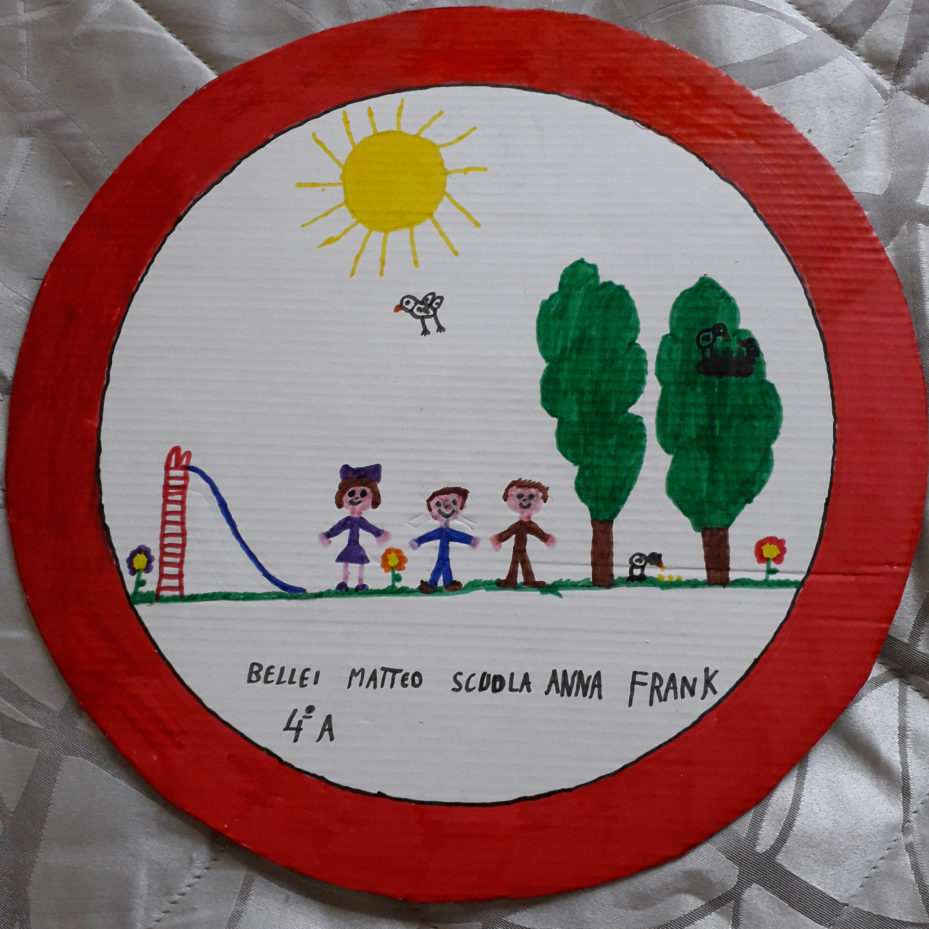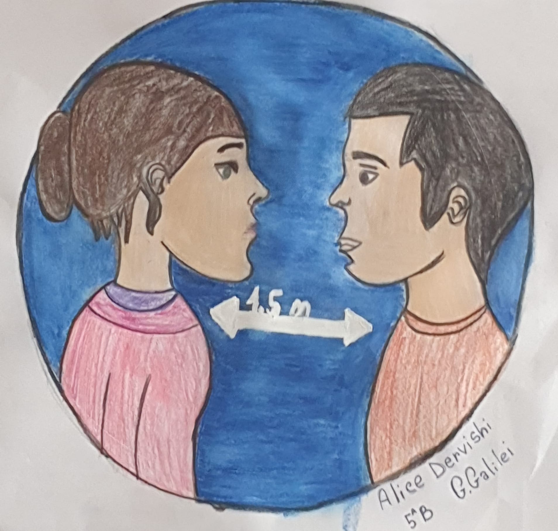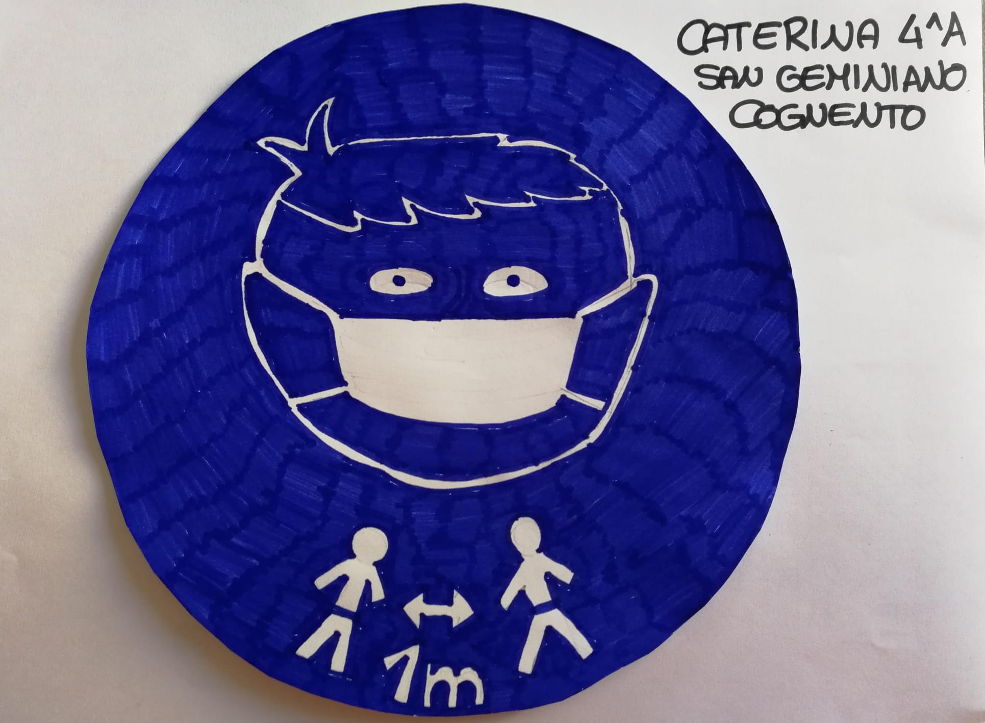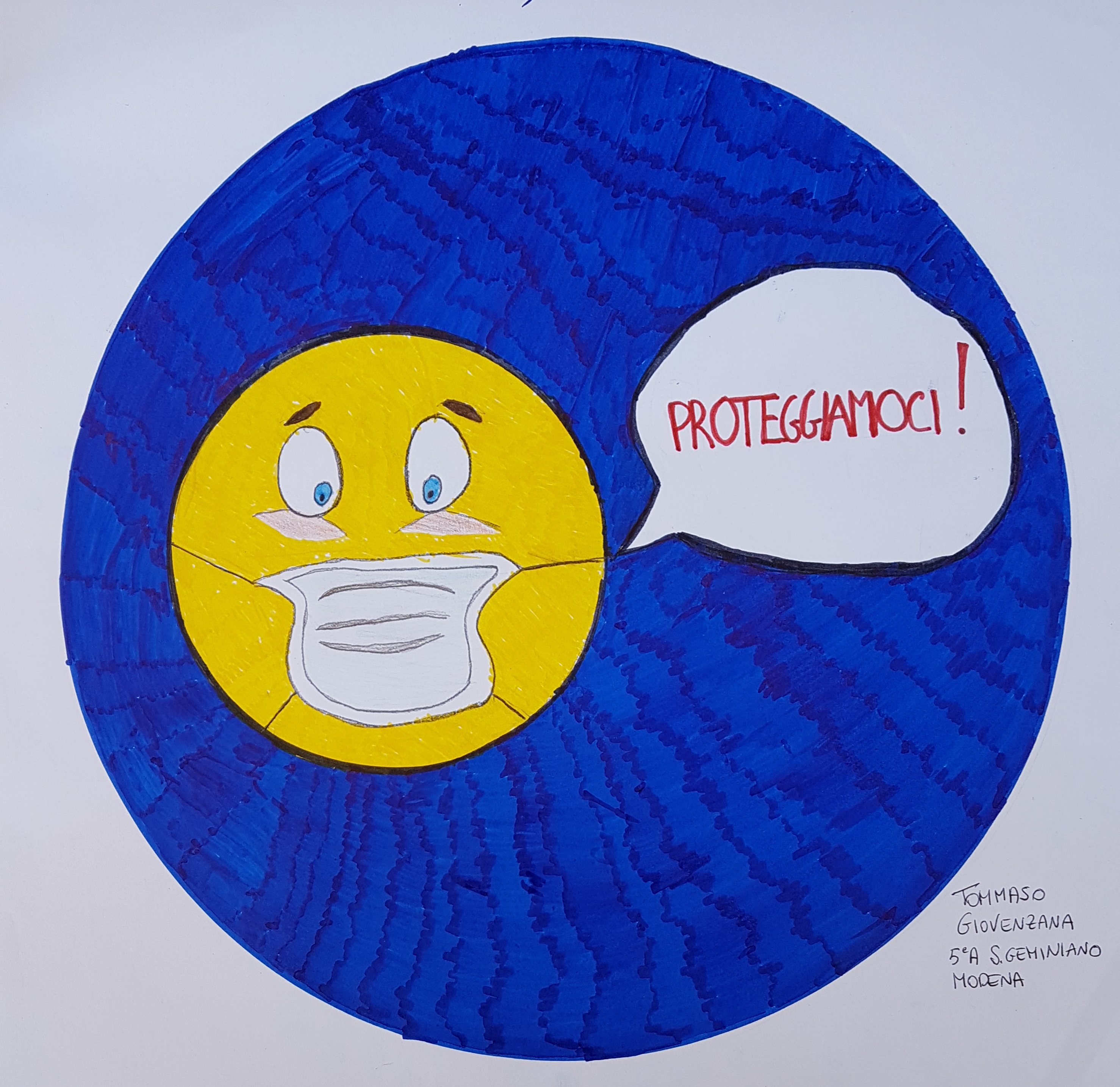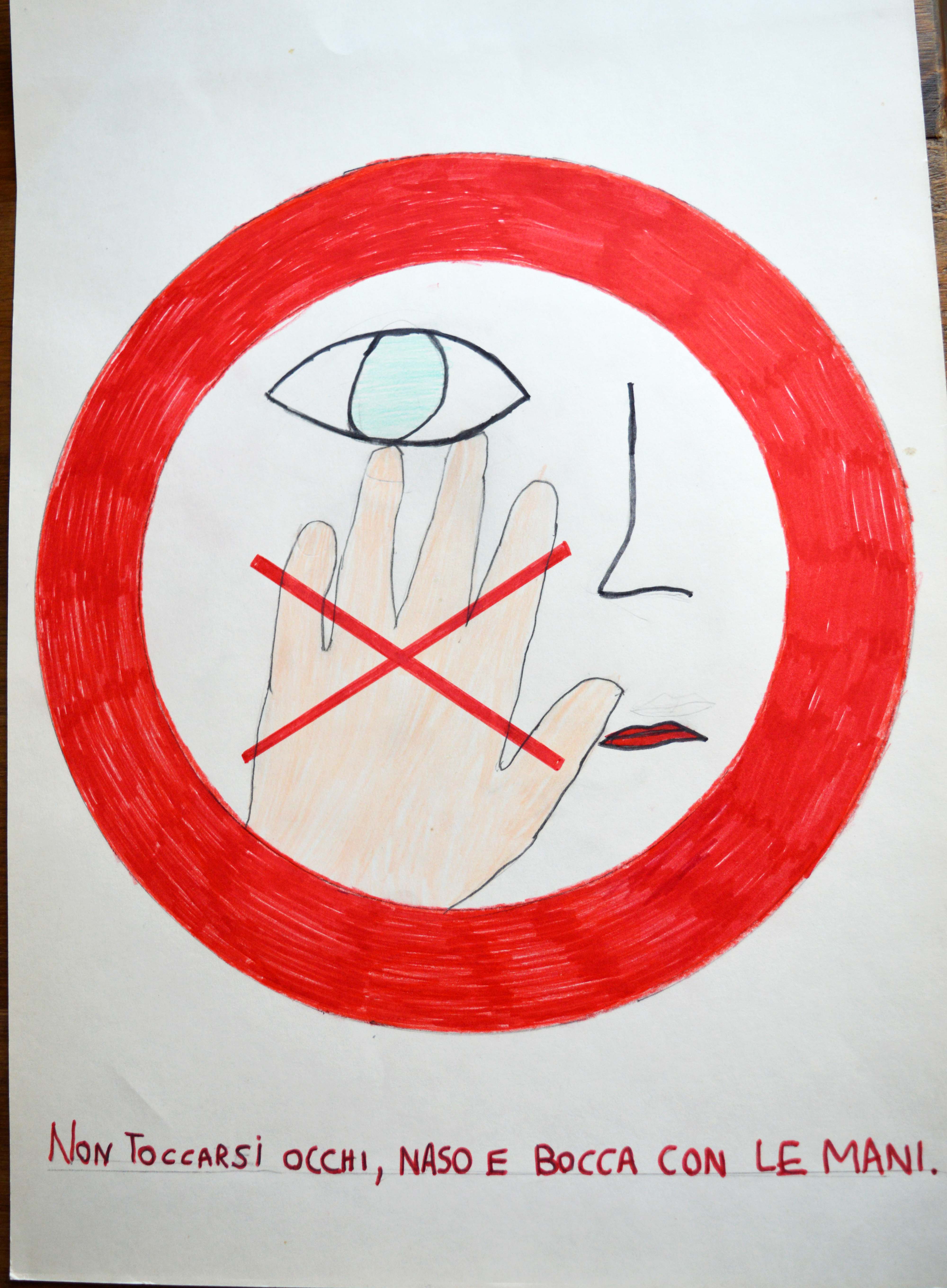 Ed è così che dentro al cerchio rosso che contraddistingue i segnali di divieto Christian mette il virus letale, Matteo disegna i bambini al parco e un compagno le mani che toccano naso e bocca; ma finiscono nei divieti anche il darsi la mano e l’andare a passeggio. Mentre i cartelli blu che danno via libera si riempiono di mascherine, guanti e gel igienizzanti, mani che si lavano e raccomandazioni al rispetto delle distanze di sicurezza ma soprattutto sul rimanere a casa.