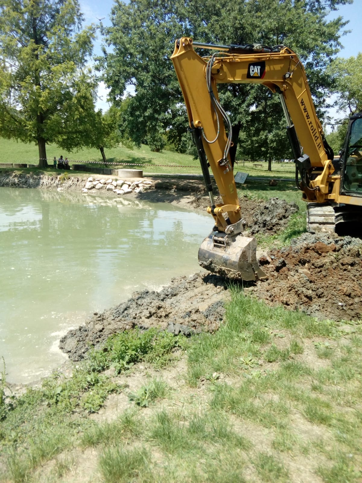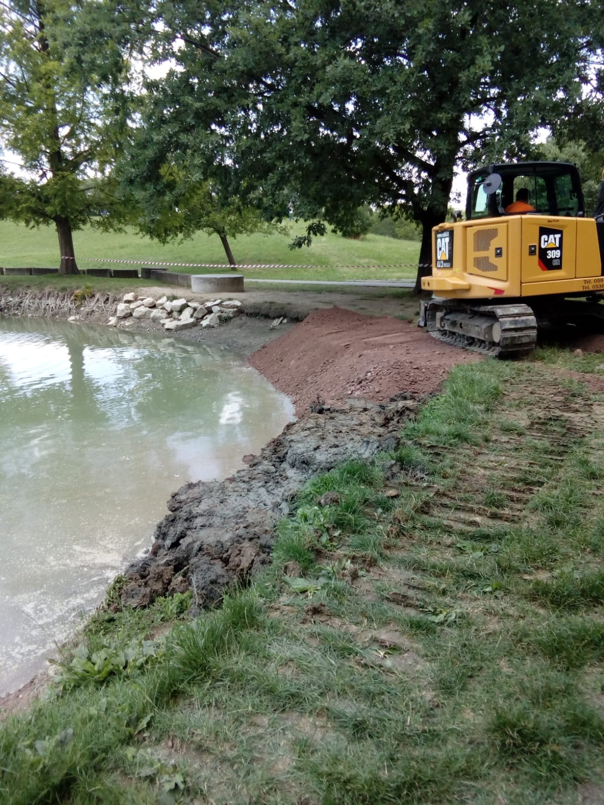 Al parco Amendola sono in corso lavori per rinforzare le rive del laghetto che avevano parzialmente ceduto nel corso dell’inverno a causa di un’infiltrazione.